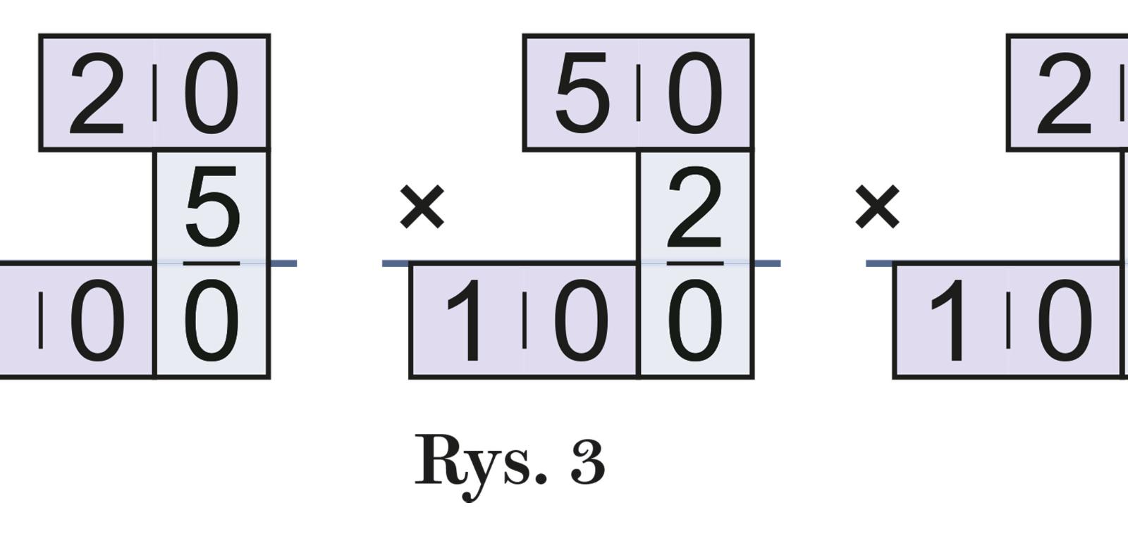 Działania z pary kamieni są jednak nietypowe, bo w praktyce nie mnożymy ani nie dodajemy w słupku liczb jednocyfrowych, dlatego właściwa dominowa arytmetyka zaczyna się od działań z trzech kamieni, czyli np. mnożeń tworzonych zgodnie ze schematem pokazanym na rys. 3 z lewej strony. Obok tego schematu są cztery zgodne z nim ekstremalne przykłady: trzy z najmniejszym iloczynem (100) i jeden z największym (366). Wszystkich 3-cyfrowych liczb, które mogą być iloczynami, jest 59, a wszystkich różnych dominowych tercetów, dających te iloczyny – 75. Różnica stąd, że te same iloczyny mogą być tworzone przez różne tercety; są też dwa przypadki, gdy ten sam tercet daje dwa różne mnożenia: z kamieni 0-5, 1-3 i 2-6 powstanie 26×5=130 lub 62×5=310, zaś 0-5, 2-3, 4-6 owocuje działaniami 46×5=230 lub 64×5=320.