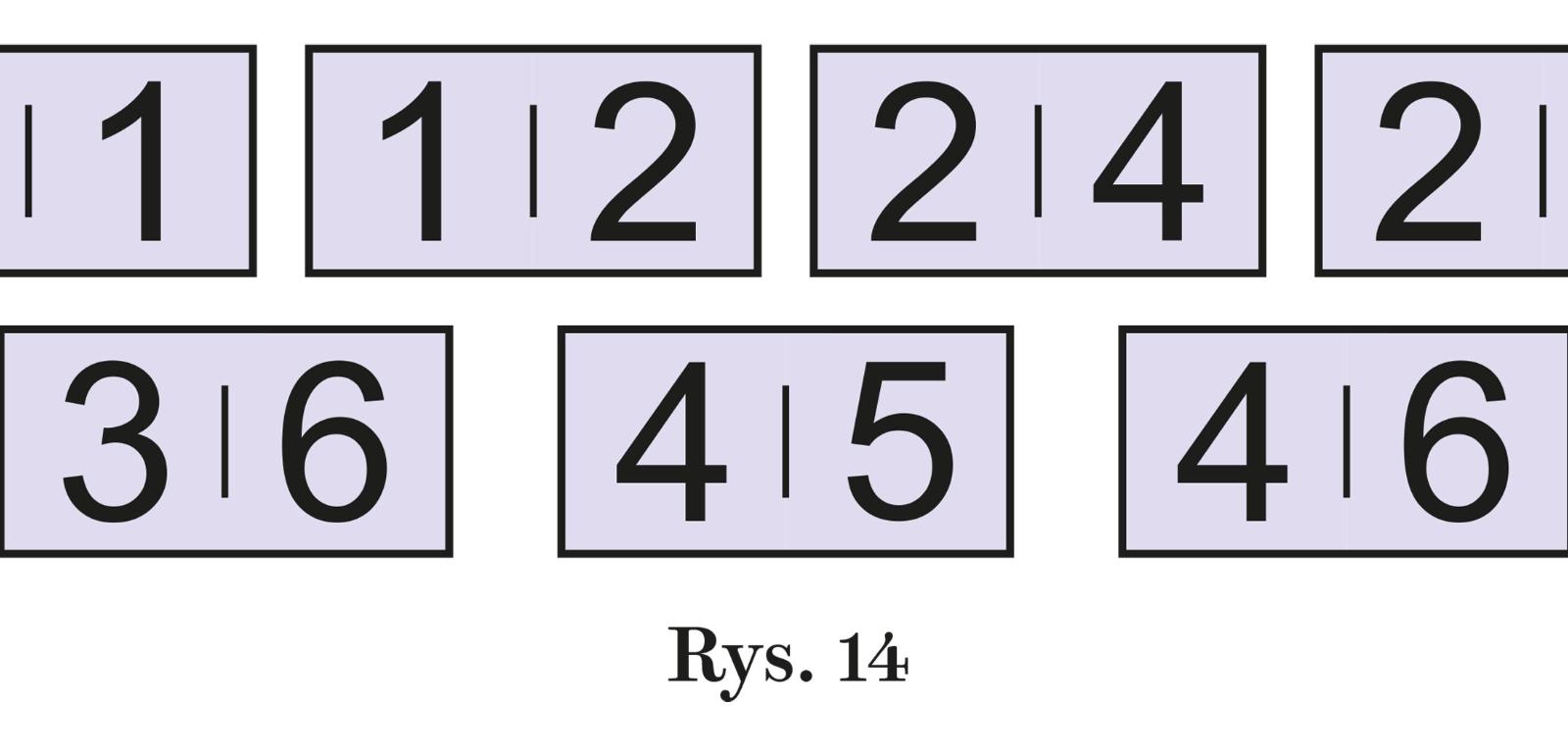 1. Z siedmiu kamieni (rys. 14) jeden należy odrzucić, a sześć pozostałych podzielić na dwie grupy po trzy kamienie w taki sposób, aby z każdej grupy można było utworzyć zarówno mnożenie, jak i dodawanie. W rozwiązaniu należy podać wszystkie cztery działania.