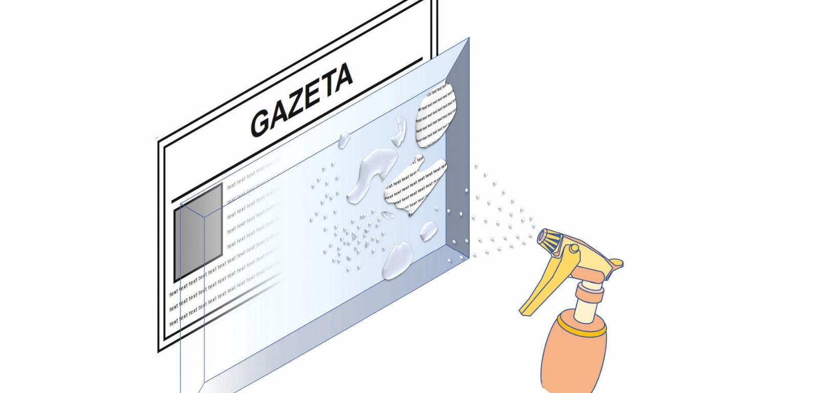 Wyjaśnienie: Doświadczenie jest modelem zaparowanej szyby. Krople naniesione spryskiwaczem zniekształcają obraz. Im jest ich więcej, tym trudniej odczytać napisy. Lecz z kolejnymi opryskami krople zaczynają się ze sobą łączyć, tworząc kałuże, przez które wyraźniej ujrzymy stronę gazety. Jeśli złożyć dwie szyby razem, woda utworzy jednolitą i przezroczystą warstwę, przez którą bez problemu da się odczytać tekst.