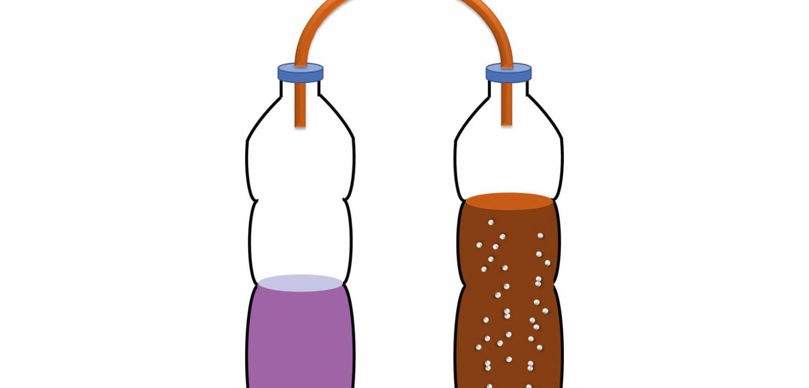 Wyjaśnienie: Napoje gazowane są najczęściej nasycane dwutlenkiem węgla. Będzie go w roztworze tym więcej, im wyższe będzie ciśnienie panujące w butelce. Odkręcenie nakrętki powoduje spadek ciśnienia, przez co dwutlenek węgla może uwolnić się z roztworu. Wydostający się dwutlenek węgla przepływa przez wężyk, rozprężając drugą butelkę. Powoli nasyca także wodę z barwnikiem, a tworzący się kwas węglowy obniża pH roztworu, powodując zmianę koloru barwnika z czerwonej kapusty z fioletowego na różowofioletowy.