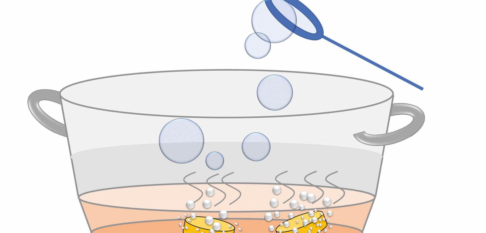 Do garnka o wysokich ściankach wrzuć 10 tabletek musujących, np. witamin. Zalej 1–2 szklankami wody.