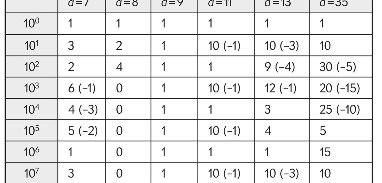 Liczby w nawiasach są praktycznymi „zamiennikami” podanych obok – równymi im modulo d (mod d), ale mniejszymi co do wartości bezwzględnej, a więc wygodniejszymi przy wykonywaniu działań. Warto zauważyć, że ciąg kolejnych wartości r dla każdego d tworzy cykl, składający się co najwyżej z d–1 wyrazów (dla d=7) albo też jest lub staje się od pewnego wyrazu stały (dla d=8 i 9).
