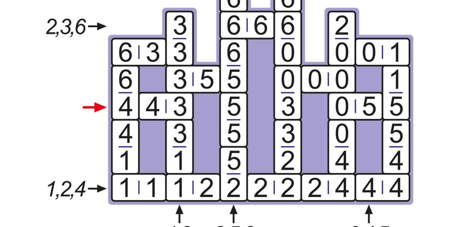 2. Jeśli do pól diagramu (rys. 4) wpiszemy dziesięć różnych cyfr, utworzą one liczby: jedną 2- i dwie 4-cyfrowe w wierszach oraz dwie 3-cyfrowe w kolumnach. Różne cyfry należy wpisać do diagramu tak, aby każda liczba za ukośnikiem obok diagramu była dzielnikiem liczby znajdującej się w wierszu przed nią lub w kolumnie nad nią. W rozwiązaniu wystarczy podać trzy liczby w rzędach.