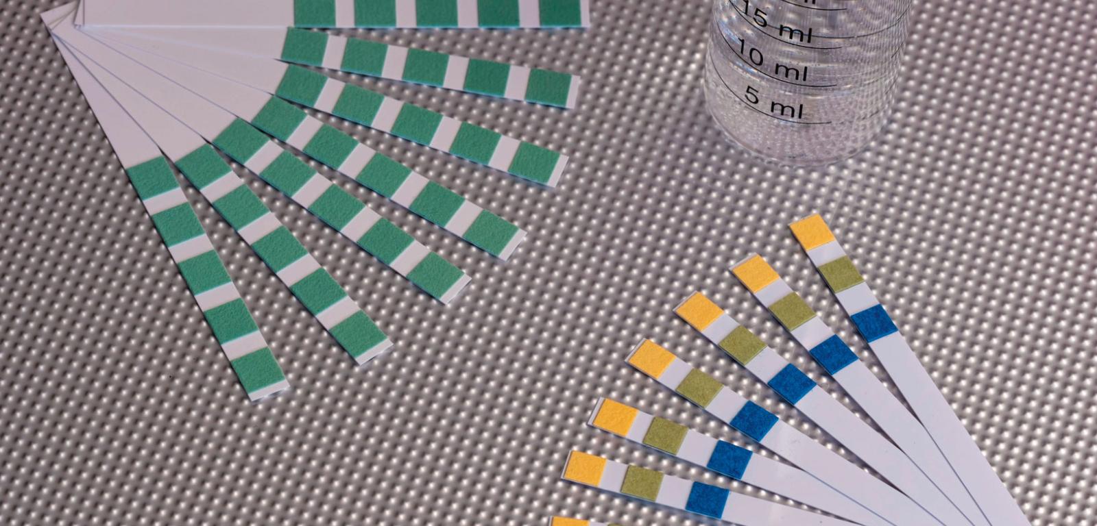 Po kartce rozprowadź kilka kropli płynu do pomiaru KH lub GH. Pozostaw do wyschnięcia. Wytnij cienkie paski. Zanurz zabarwioną część paska w wodzie mineralnej.
