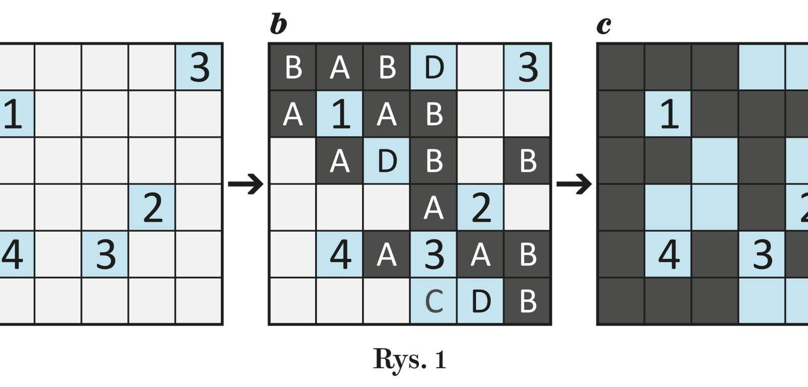 Tok rozwiązywania przykładowego zadania (rys. 1a) obrazuje elegancką, klarowną logikę ujawniania stawów i grobli: najpierw (rys. 1b) zaczerniane są pola rozdzielające stawy (A), potem te, których stawy na pewno nie sięgną (B), oraz zaniebieszczane te, których stawy muszą sięgnąć, aby miały właściwą wielkość (C); a wreszcie te, których stawy powinny sięgnąć, aby na grobli nie pojawił się kwadrat 2×2 (D). Na koniec nietrudno zadbać o rozmiary wszystkich stawów oraz o spójność grobli – aż do wypełnienia całego diagramu (rys. 1c). Oczywiście, droga do rozwiązania bywa czasem bardziej wyboista, wymagająca nawet błądzenia, czyli korzystania z metody prób i błędów.