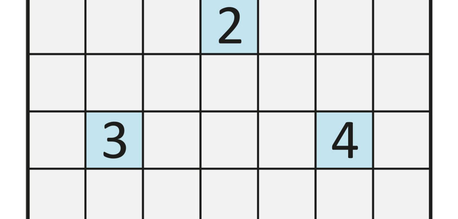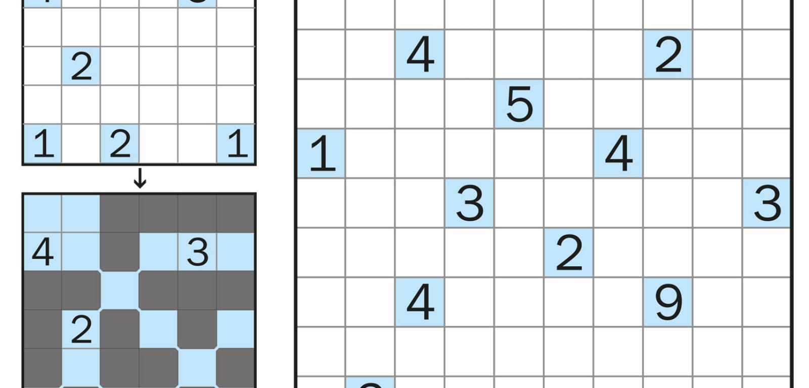 4. Archipelag to „bliźniak” nurikabe, ale z jego nazwą wiąże się inny entourage – grobla jest pocięta i tworzy wyspy, a stawy zmieniają się w laguny między wyspami (przykład i zadanie na rys. 12). Każde pole z liczbą jest częścią prostokątnej laguny złożonej z tylu pól, jaka jest wartość liczby. W odróżnieniu od nurikabe liczb może być mniej niż lagun, czyli nie każda laguna musi być ujawniona dzięki liczbie, ale też żadnej laguny nie może oznaczać więcej niż jedna liczba. Wszystkie laguny tworzą jedną całość – są połączone wąskimi przesmykami, znajdującymi się w niektórych ich rogach, zatem z każdej laguny można przedostać się przez te rogi „drogą morską” na dowolną inną lagunę. Zadanie polega na zaczernieniu wysp i zaniebieszczeniu lagun. Na wyspach kwadraty 2×2 są zabronione, ale w lagunach mogą się pojawić. W rozwiązaniu wystarczy podać, w ilu i jakiej wielkości lagunach nie została ujawniona cyfra.