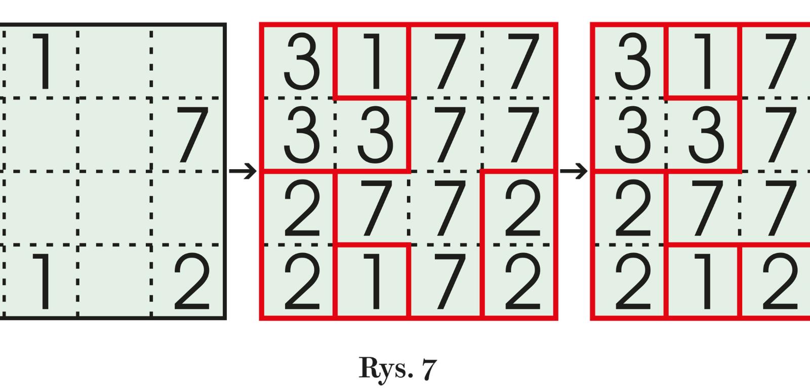 Praktycznie rozwiązywanie polega na wpisywaniu w kratki liczb – każda powinna być równa wielkości polimina, w którym się znajduje. Na rys. 7 jest miniprzykład z dwoma rozwiązaniami z kwadratem 2×2 w septominie (prawy górny róg) – w drugim rozwiązaniu są nawet dwa takie kwadraty. Znalezienie jedynego rozwiązania bez kwadratu 2×2 nie powinno być trudne.