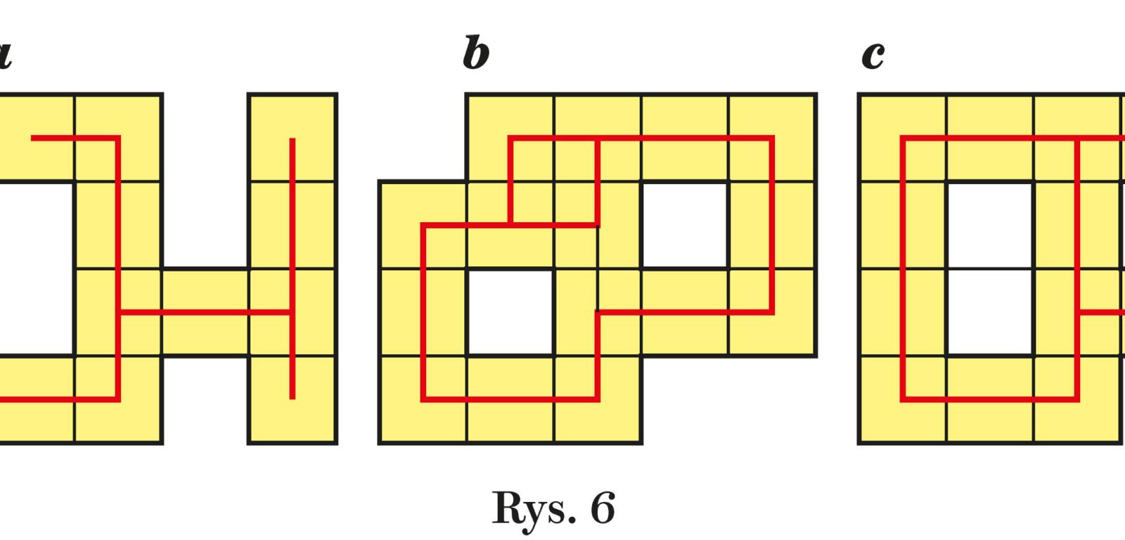 Jak wynika z powyższych rozważań, polimina można podzielić na dwie grupy, uwzględniając drogi, łączące środki tworzących je kwadratów, stykających się bokami (czerwone linie na rys. 6; k=15, czyli 15-mina). Jedne zawierają układ mniej lub bardziej rozgałęzionych dróg, nigdzie nietworzących cyklu (np. rys. 6a); w drugich występuje przynajmniej jeden cykl. W poliminach bez cyklu nigdy nie ma kwadratu 2×2, bo jest on cykliczny. Natomiast w poliminach z cyklem kwadrat 2×2 może się pojawić (rys. 6b), ale nie musi (rys. 6c).