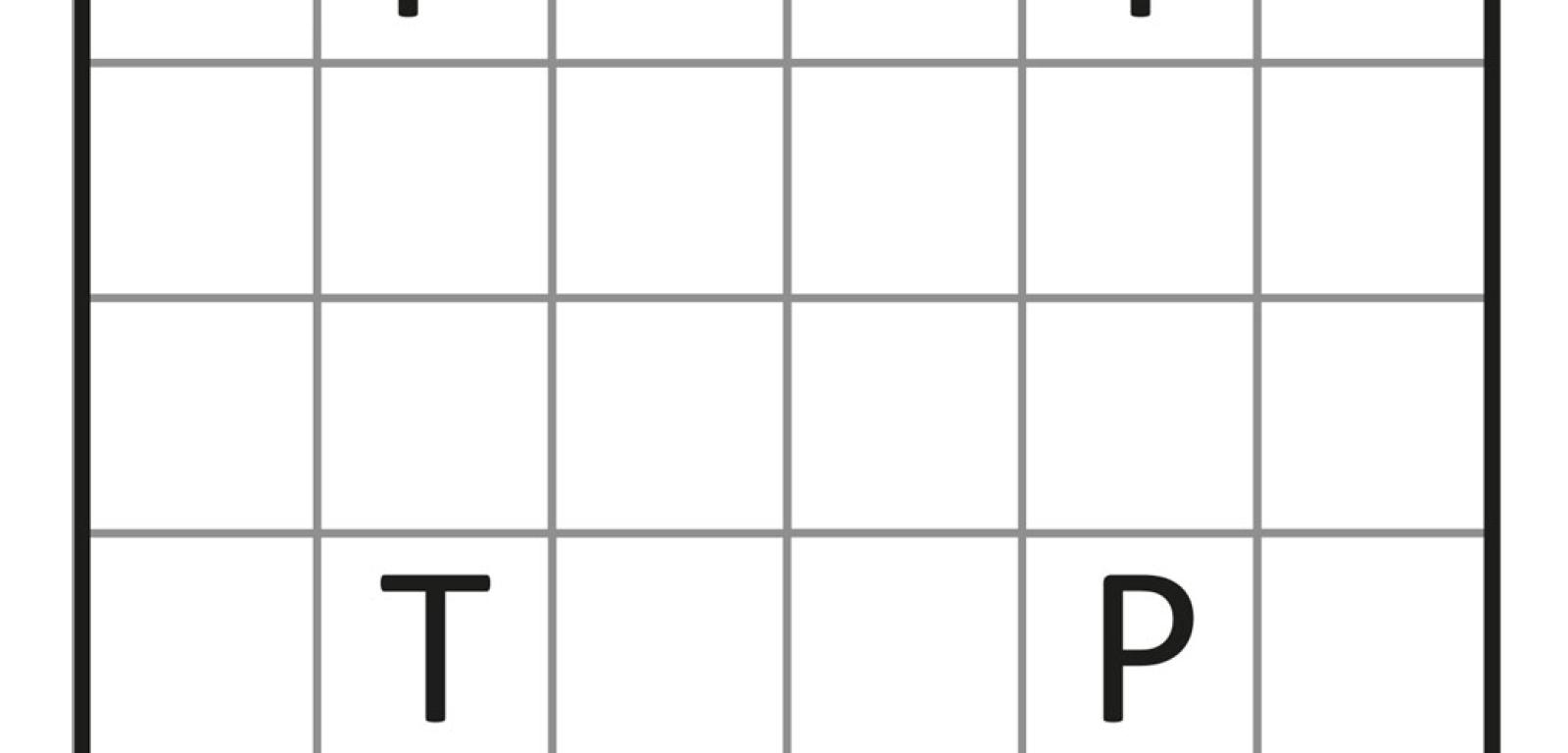 3. Z ośmiu figur – czterech różnych tetromin i czterech różnych pentomin – należy ułożyć kwadrat 6×6 (rys. 11). Pola z literą T powinny być pokryte przez tetromina, a pola z literą P – przez pentomina. Żadna z figur nie może zawierać kwadratu 2×2, czyli wykluczone są dwie jasnoniebieskie figury z rys. 3. W układance należy więc użyć czterech ciemnoniebieskich tetromin i czterech pentomin wybranych z jedenastu ciemnoniebieskich – w tym obowiązkowo pentomina w kształcie krzyża.