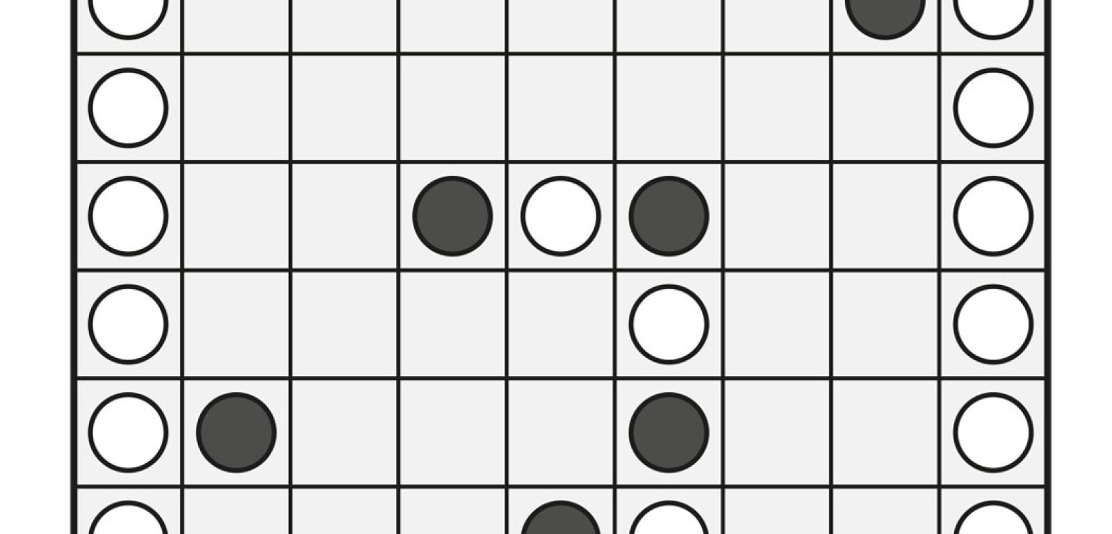 2. To nietypowe, „incydentalne” yin-yang (rys. 10), czyli takie, w którym jedna z wyznaczanych części całkowicie otacza drugą, więc ujawnione zostały wszystkie brzegowe białe kółka zewnętrznej części. Zasady rozwiązywania opisane są w artykule. W rozwiązaniu wystarczy podać, ile czarnych i białych kółek jest na obu przekątnych diagramu.