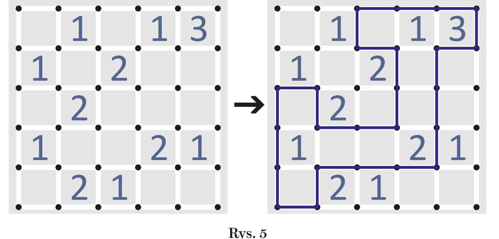 Układ dwu części w yin-yang, w którym jedna część całkowicie otacza drugą, byłby do przyjęcia, gdyby zakaz 2×2 dotyczył tylko części wewnętrznej. Wówczas jednak byłoby to właściwie odmienne zadanie, przypominające inną dość popularną łamigłówkę – slitherlink, czyli pokropkę, a więc stanowiące jakby jej odmianę. Kluczem do wyznaczenia linii łamanej zamkniętej, w przybliżeniu odpowiadającej brzegowi wewnętrznej części w yin-yang, są w pokropce zamiast ujawnionych kółek liczby – 0, 1, 2, 3. Każda oznacza, ile boków kratki z daną liczbą powinno stanowić fragment wykreślanej linii. W rozwiązaniu przykładu na rys. 5 uwzględniony jest zakaz braku kwadratu 2×2 wewnątrz pętli. Łatwo zauważyć, że po pominięciu tego zakazu pojawi się więcej rozwiązań (ile konkretnie?).