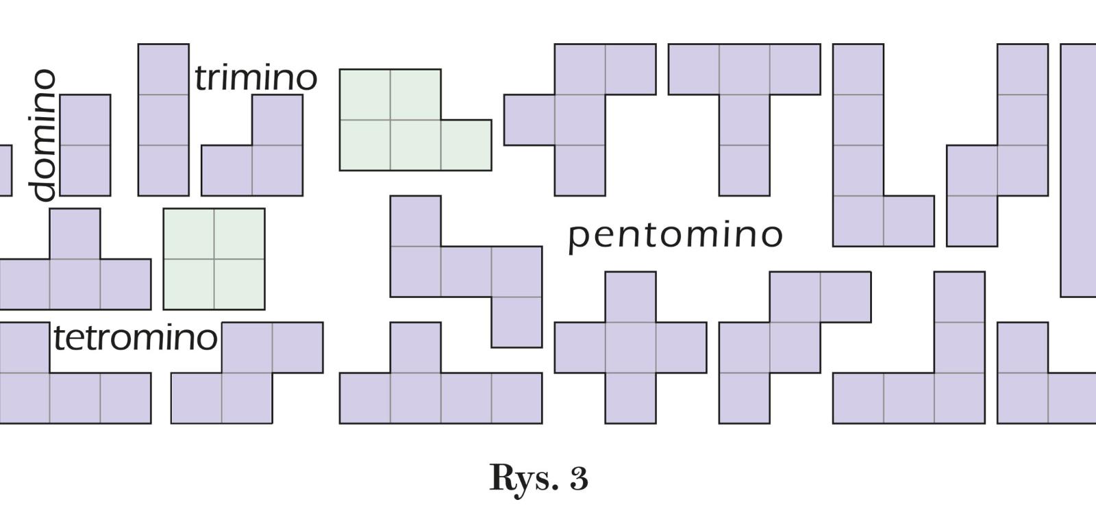 Zarówno grobla, jak i obydwie części w yin-yang są wielokątami złożonymi z kratek, czyli małych kwadratów, i ogólnie zwane są poliminem. W zależności od liczby kwadratów (k), tworzących dane polimino, w nazwie zmienia się cząstka przed „-mino”. Jest więc jedno monomino i jedno domino, dwa trimina, pięć tetromin, 12 pentomin (rys. 3) itd., aż do 4665 10-kwadratowych dekamin. Dalej, gwoli jasności, korzysta się zwykle z liczb zamiast przedrostków. Grobla na rys. 1c jest więc 23-minem (z przedrostkiem byłaby trikozaminem), a w rozwiązaniu yin-yang (rys. 2c) pojawiają się czarne 16-mino i białe 20-mino.