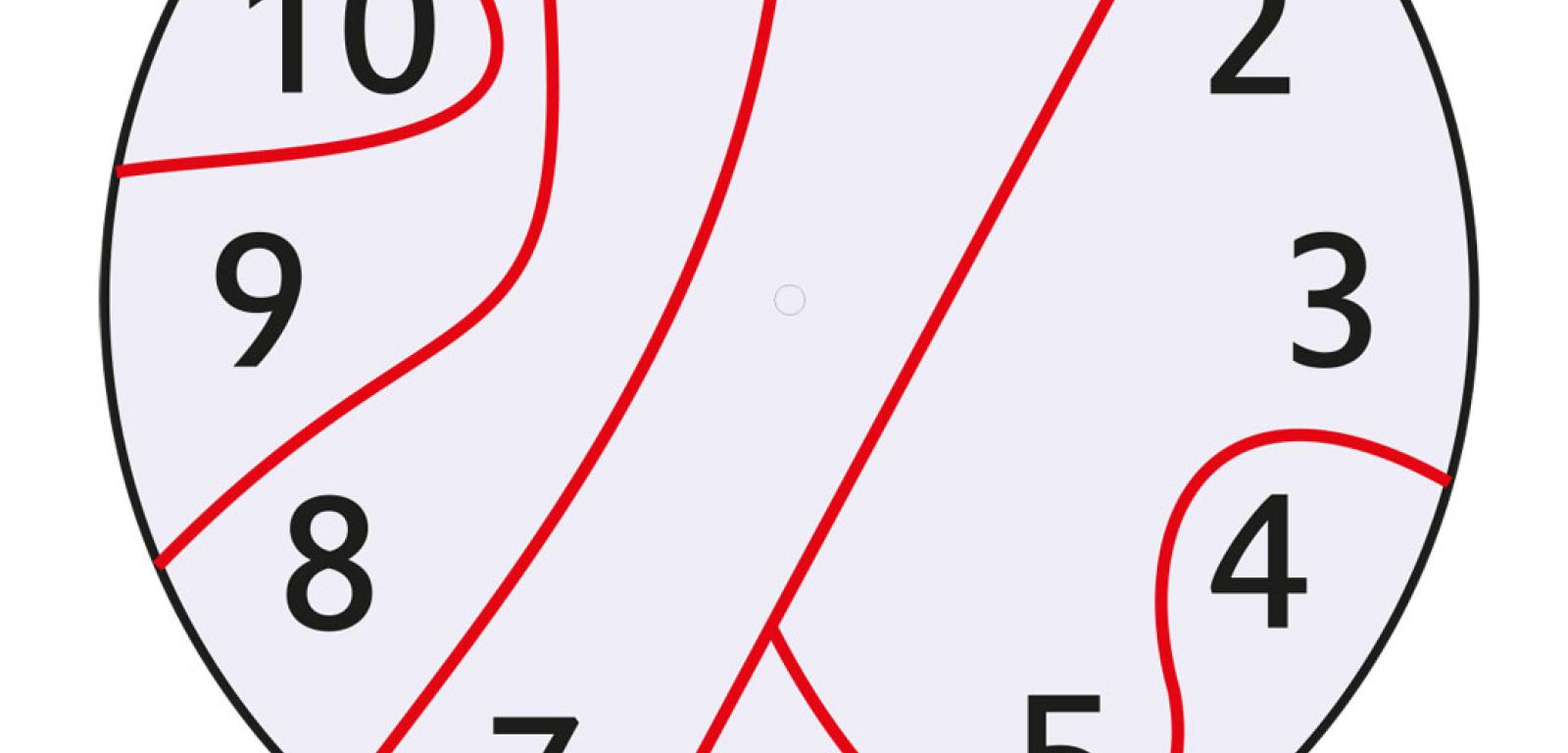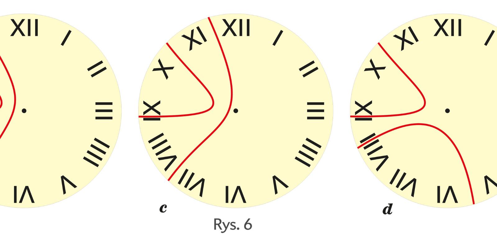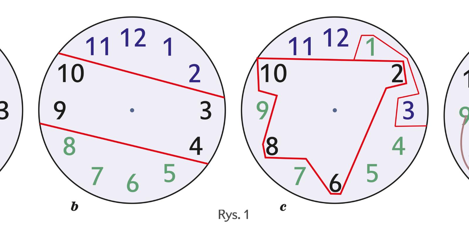Czy rozwiązanie na rys. 1b jest istotnie jedynym? Tak, ale nie wtedy, gdy tekst zadania brzmi dokładnie tak, jak wyżej, co często się zdarza także w materiałach edukacyjnych – wówczas bowiem rozwiązania są… 102. Tyle jest bowiem sposobów podziału zbioru liczb od 1 do 12 na trzy podzbiory o jednakowej sumie równej 26. I na tyle sposobów można podzielić tarczę zegara, jeśli przyjąć – co zresztą jest zgodne z rzeczywistością – że cyfry nie są „przyklejone” do brzegu tarczy, czyli między nimi a brzegiem da się poprowadzić linie dzielące. Na rys. 1c znajduje się przykład takiego „zakręconego” podziału (1+4+5+7+9=2+6+8+10=3+11+12=26).
