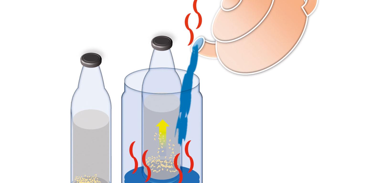 Wyjaśnienie: Doświadczenie dobrze ilustruje zjawisko konwekcji – przekazywania ciepła związanego z ruchem cząstek. Wrzątek szybko nagrzewa szkło i wodę w butelce. Gęstość wody z dna obniża się i zaczyna się ona unosić na powierzchnię, powodując kotłowanie się i ruch brokatu, z łatwością porywanego przez ruchy cieczy. Na podobnej zasadzie unoszą się nie tylko balony na gorące powietrze, lecz podrywane są cząstki kurzu, pyłu, bakterie i zarodniki grzybów, które mogą być potem roznoszone na ogromne odległości.