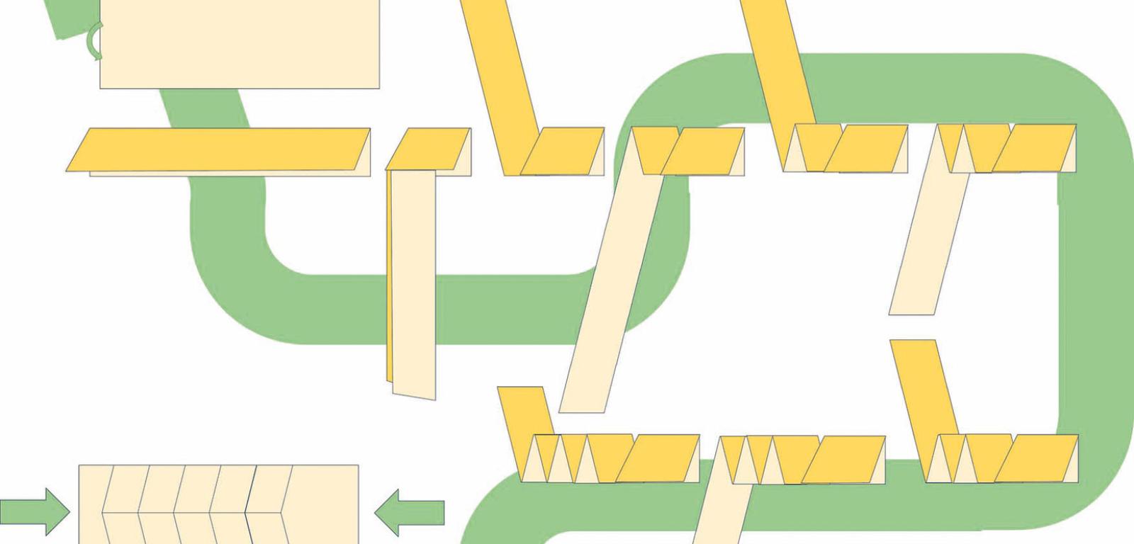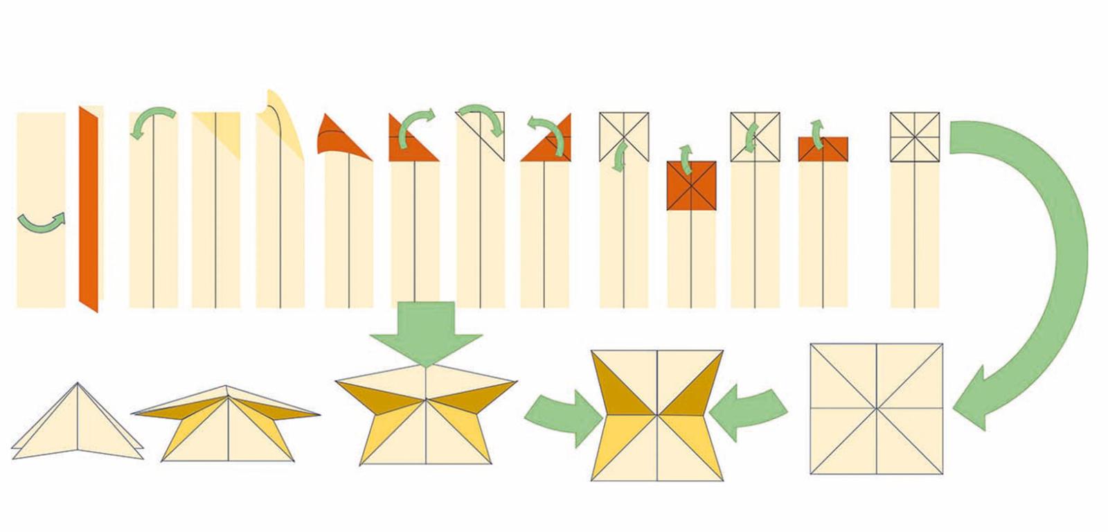 Wyjaśnienie: Otrzymujesz coś w rodzaju uproszczonego złożenia Miura. Łącząc ze sobą kilka kawałków (np. taśmą klejącą), możesz uzyskać arkusz o niezwykłych własnościach. W małej przestrzeni pozwala on upakować dużą powierzchnię arkusza. Łatwo składa się i rozkłada. Częściowo rozłożony tworzy bardzo stabilne trójwymiarowe rusztowanie – podłoże, które może utrzymać kubek z wodą. Tego typu złożenie nadaje się do tworzenia kurtyn zacieniających czy parawanów.