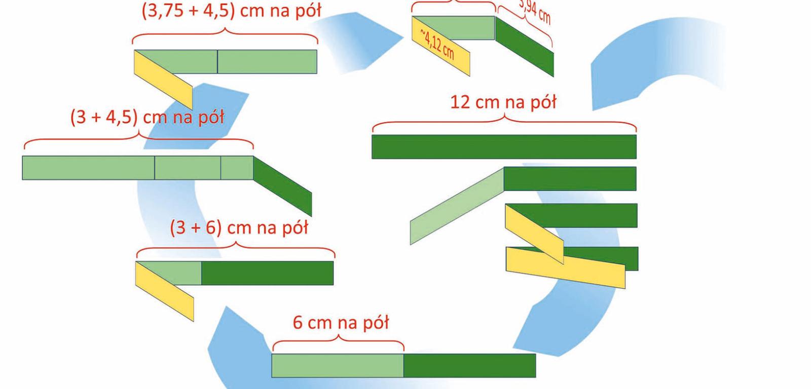 Jak podzielić pasek na trzy równe części? Z kartki papieru ksero wytnij pasek o długości 12 cm i szerokości 2 cm. Zegnij go na pół jak na schemacie. Złóż lewe skrzydło na pół, a powstała linia zagięcia niech wyznaczy nowe prawe skrzydło. Złóż to nowe prawe skrzydło na pół – powstała linia wyznaczy nowe lewe skrzydło. Złóż nowe lewe skrzydło na pół, wyznaczając nowe skrzydło prawe. Powtarzaj procedurę jeszcze kilka razy.