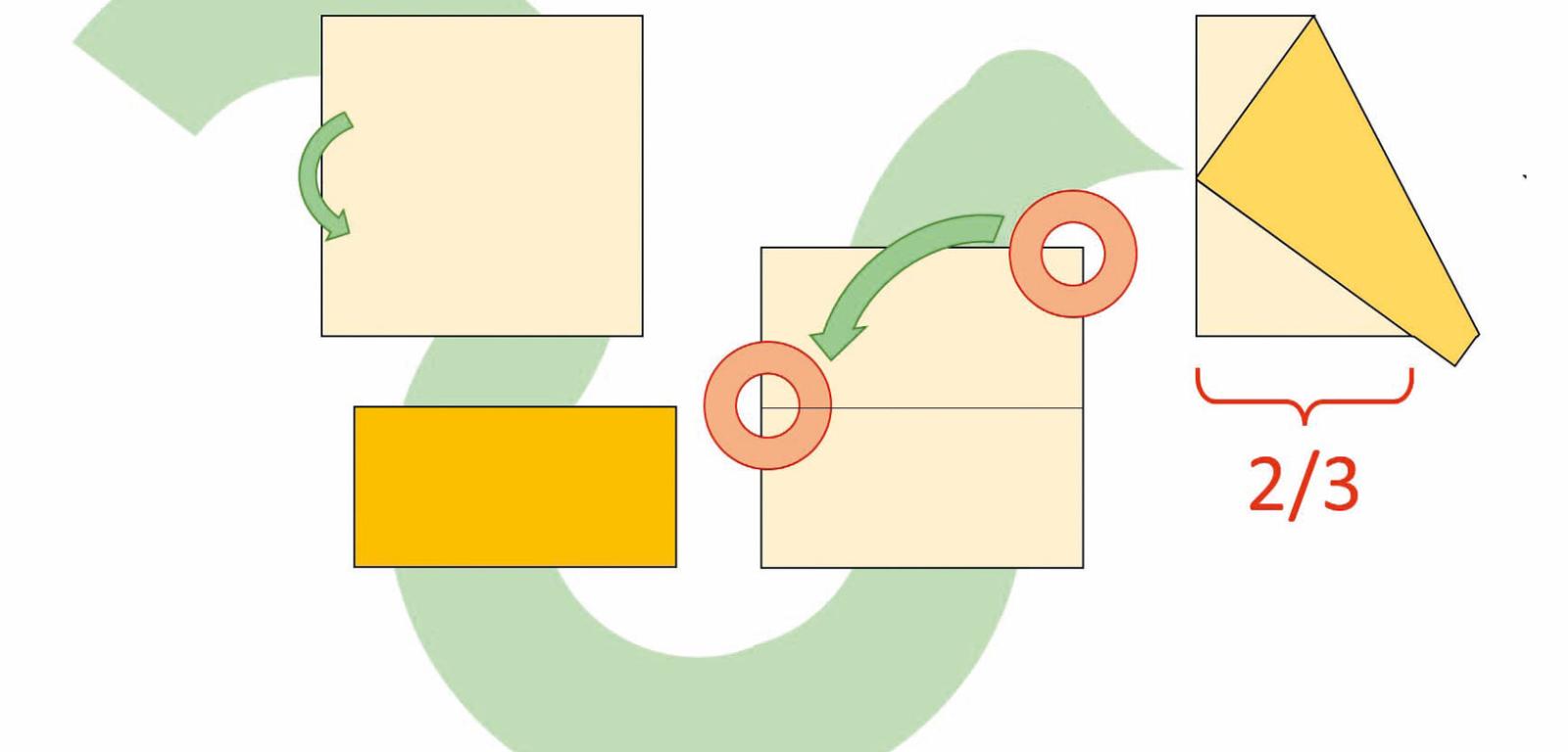 Przygotuj kwadrat z kartki. Złóż ją na pół i rozłóż. Na krawędzi powstał punkt, w który staraj się trafić szpicem jednego z przeciwległych rogów kartki. Podzieli to kartkę na czworokąt i dwa stykające się wierzchołkami trójkąty – dłuższa przyprostokątna większego trójkąta (lewego) ma 2/3 długości boku kwadratu.