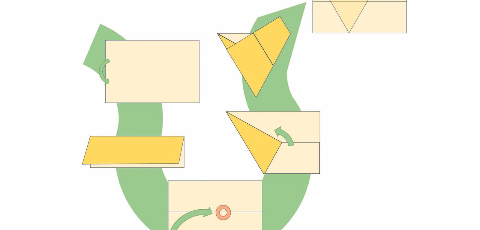 Sprężyna z papieru. Z kartki wytnij prostokąt 21 × 4 cm. Złóż na pół wzdłuż dłuższej krawędzi i rozłóż. Wykonaj złożenie pozwalające wyznaczyć kwadrat z prostokąta, wyznacz obie jego przekątne i brakujący bok. Złóż kwadrat na pół (dzieląc go złożeniami na cztery mniejsze kwadraty). Widzisz dwa małe kwadraty – palcami ściśnij lewy, a rozchyl ten drugi i wepchnij do środka jego róg. Potem to samo zrób z drugiej strony. Otrzymujesz coś w rodzaju czteroramiennej gwiazdy-piramidki. Powtarzaj na całej długości paska.