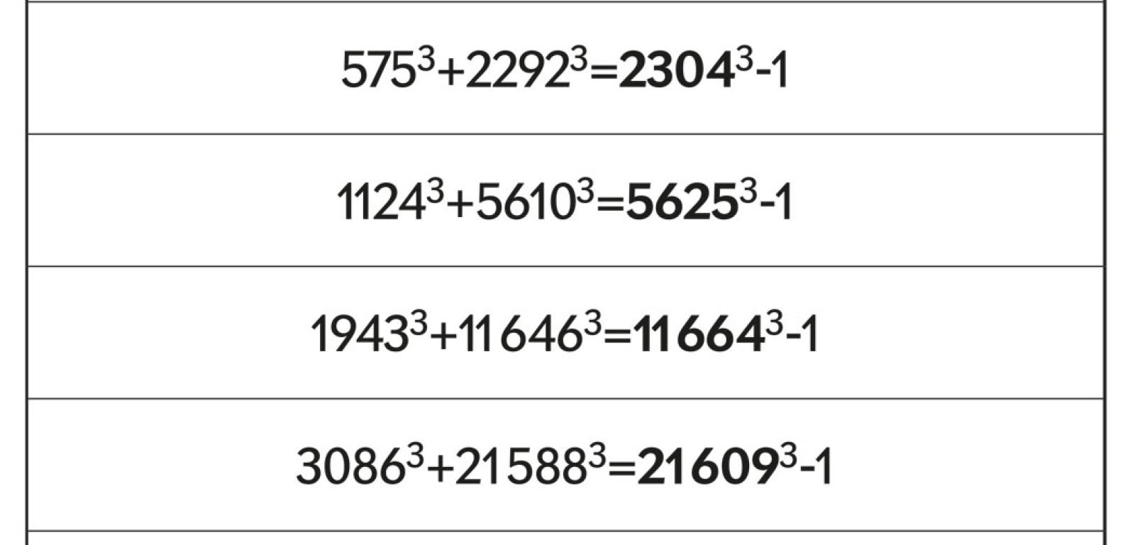 Wartości z w tym podciągu są kwadratami tworzącymi ciąg o wzorze zn=9n4. Korzystając z tego wzoru, można wyznaczać dowolnie duże z spełniające równanie x3+y3=z3–1. Trudne będzie tylko szukanie odpowiednich wartości x i y.