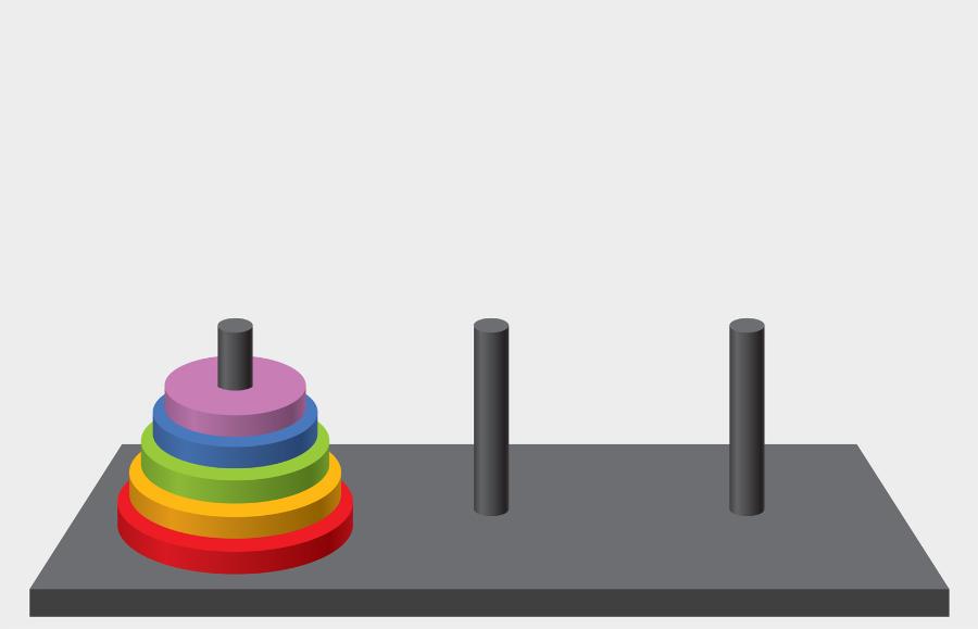 Wieża Hanoi składa się z małej planszy z trzema słupkami. Na lewym słupku znajduje się pięć krążków różnej średnicy, mających otwór pośrodku – umieszczonych w kolejności od największego na dole do najmniejszego na górze. Celem jest przeniesienie wszystkich krążków z lewego słupka na prawy w jak najmniejszej liczbie ruchów – z zachowaniem ich początkowej kolejności na lewym słupku i korzystaniem z pośrednictwa środkowego słupka. Każdy ruch polega na zabraniu krążka z jednego słupka i nałożenia go na inny, jednak większego krążka nigdy nie wolno kłaść na mniejszym. Ile i jakich ruchów potrzeba, aby uporać się z zadaniem?