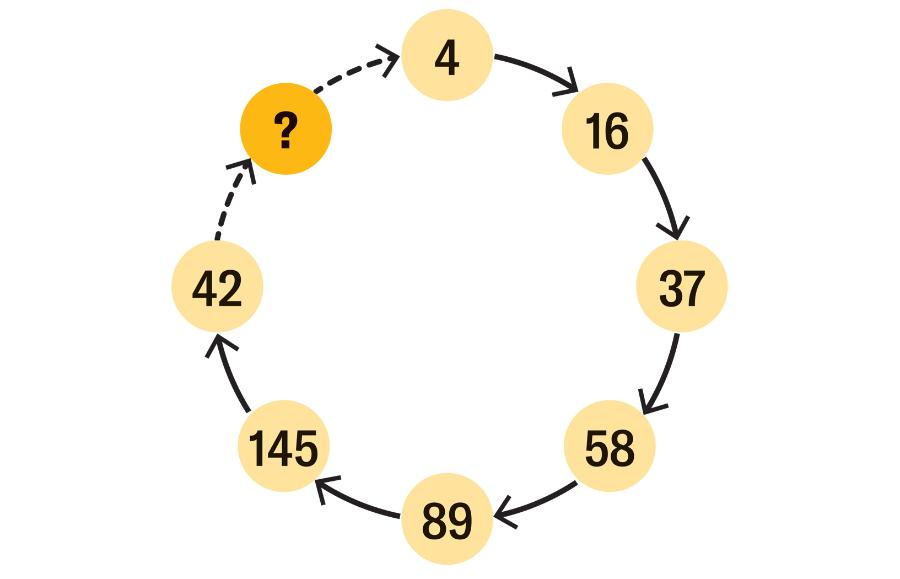 Każda kolejna liczba w cyklicznym ciągu stanowi sumę kwadratów cyfr poprzedniej liczby, zatem brakującą liczbą jest 42+22=20.