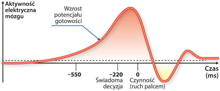 Nad tym zagadnieniem pochylił się na początku lat 80. amerykański fizjolog Benjamin Libet. Wyniki jego eksperymentów ucieszyły deterministów uważających, że wolna wola nie istnieje. Libet odkrył mianowicie, że chociaż poruszenie palcem następuje 200 ms po podjęciu przez badanego świadomej decyzji o ruchu, to z kolei ową świadomą decyzję poprzedza pojawienie się potencjału gotowości. Powolny i bardzo niewielki wzrost tego potencjału można zauważyć już na 1,5 s przed drgnięciem palca.