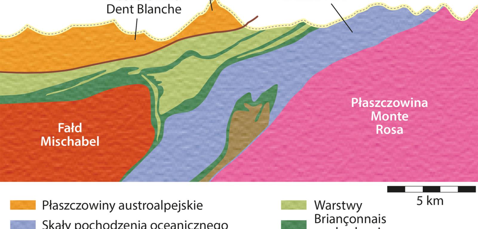 Skąd w ogóle wziął się Matterhorn? Jego prehistoria sięga zamierzchłych czasów sprzed ok. 200 mln lat, kiedy to superkontynent Pangea rozpadł się na dwa kawałki. Powstały wtedy dwa kontynenty – południowy Gondwana i północny Laurazja, oddzielone oceanem Tetyda. Skały dziś tworzące Matterhorn były w tamtym czasie częścią Gondwany, ale jakieś 100 mln lat później weszły w skład niewielkiego lądu, który powędrował na północ w stronę Europy, porzucając Gondwanę. Wkrótce zresztą ona cała zaczęła się rozlatywać na mniejsze kawałki. Mniejsze nie znaczy, że małe. Jednym z nich była np. Afryka, która także ruszyła na północ, ku Europie. Wkrótce pomiędzy zbliżającymi się do siebie Afryką i Europą powstała potężna strefa tektonicznego zgniotu. Znajdujące się w niej osady morskie zostały zaburzone i przesunięte przez siły drzemiące wewnątrz globu. W efekcie w skorupie ziemskiej powstały trzy olbrzymie fałdy skalne zwane płaszczowinami. Leżały jeden na drugim. Matterhorn jest ocalałym fragmentem najwyższego z tych fałdów, w którego skład weszły osady należące do kontynentu afrykańskiego. Stąd zresztą wzięło się jeszcze jedno określenie słynnego szczytu, nadane mu przez geologów: afrykańska góra.