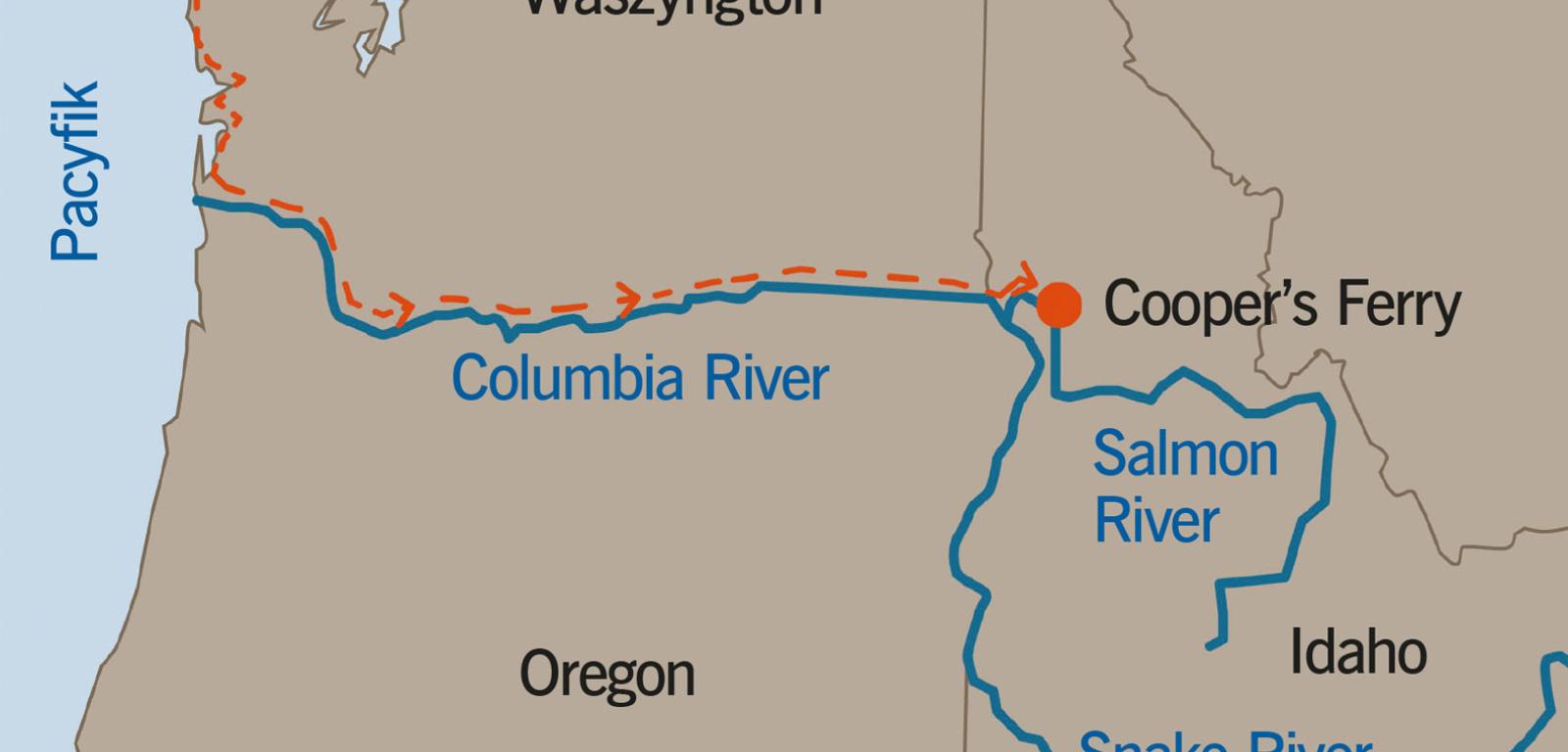 Salmon River, czyli Rzeka Łososiowa, wrzyna się w jedno z pasm Kordylierów na głębokość ponad 2 km, tworząc kanion głębszy od Wielkiego Kanionu Kolorado. Po pokonaniu niemal 700 km wpada do znacznie większej Snake River, która z kolei łączy swoje wody z jeszcze większą rzeką Columbia, wpadającą do Oceanu Spokojnego w północno-zachodniej części Stanów Zjednoczonych. Stąd z morza wpływają łososie, które szukają miejsca na tarło. Podążają w górę wszystkich trzech rzek, aż w końcu docierają do górskich strumieni w odludnych Górach Rzeki Łososiowej w środkowym Idaho. Tak jest od tysięcy lat. Również przez tysiące lat te zmierzające w rodzinne strony ryby były wyławiane przez Indian z plemienia Niimíipuu, co w ich języku oznacza zwyczajnie „ludzie”. Rzekę dostarczającą im takiej obfitości pokarmu otaczali czcią. Jedno z ich ulubionych łowisk znajdowało się w miejscu, które biali pod koniec XIX w. nazwali Cooper’s Ferry.