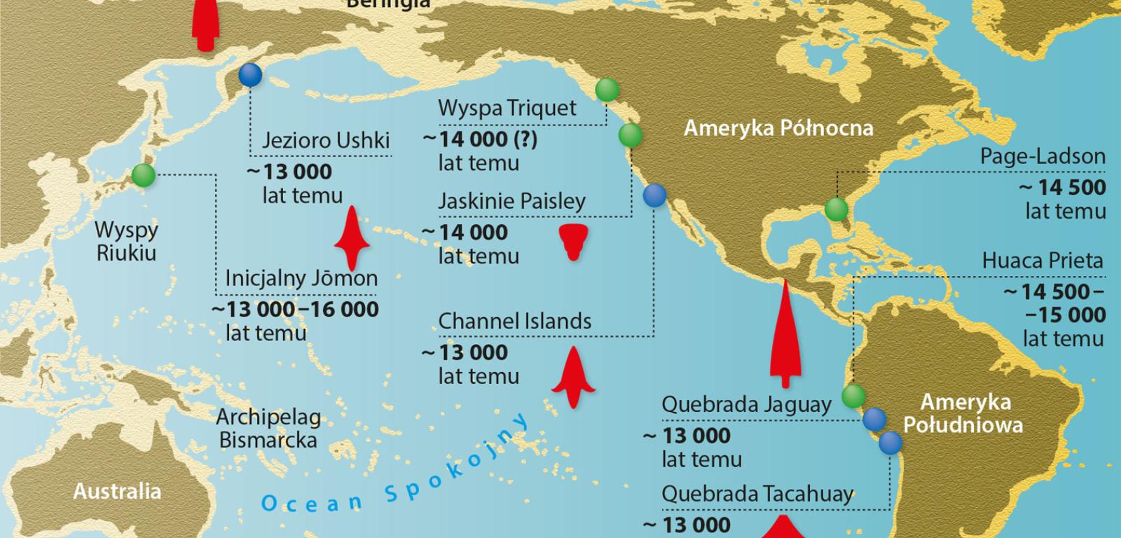 Gdzie znajdowała się ojczyzna tych przybrzeżnych migrantów? Podczas wykopalisk w Cooper’s Ferry badacze zauważyli, że wygrzebywane przez nich kamienne groty przypominają te ze stanowisk archeologicznych po drugiej stronie Pacyfiku, m.in. na japońskiej wyspie Hokkaido, a także na sąsiednim Sachalinie oraz na ciągnącym się w stronę Kamczatki archipelagu Kuryli. Na tej podstawie Davis i drugi archeolog David Madsen postawili śmiałą hipotezę, którą przedstawili w grudniu ub.r. w czasopiśmie „Quaternary Science Reviews”. Według nich pierwsi do Ameryki dotarli przed 16–17 tys. lat ludzie, których przodkowie dawno temu zamieszkali na wyspach północno-zachodniego Pacyfiku: Hokkaido, Sachalinie i Kurylach. Owi przodkowie wcześniej przywędrowali z wnętrza azjatyckiego lądu, zapewne z południowej Syberii – mogło to być 25–30 tys. lat temu – po czym stopniowo odizolowali się od innych mieszkańców Azji Północno-Wschodniej.