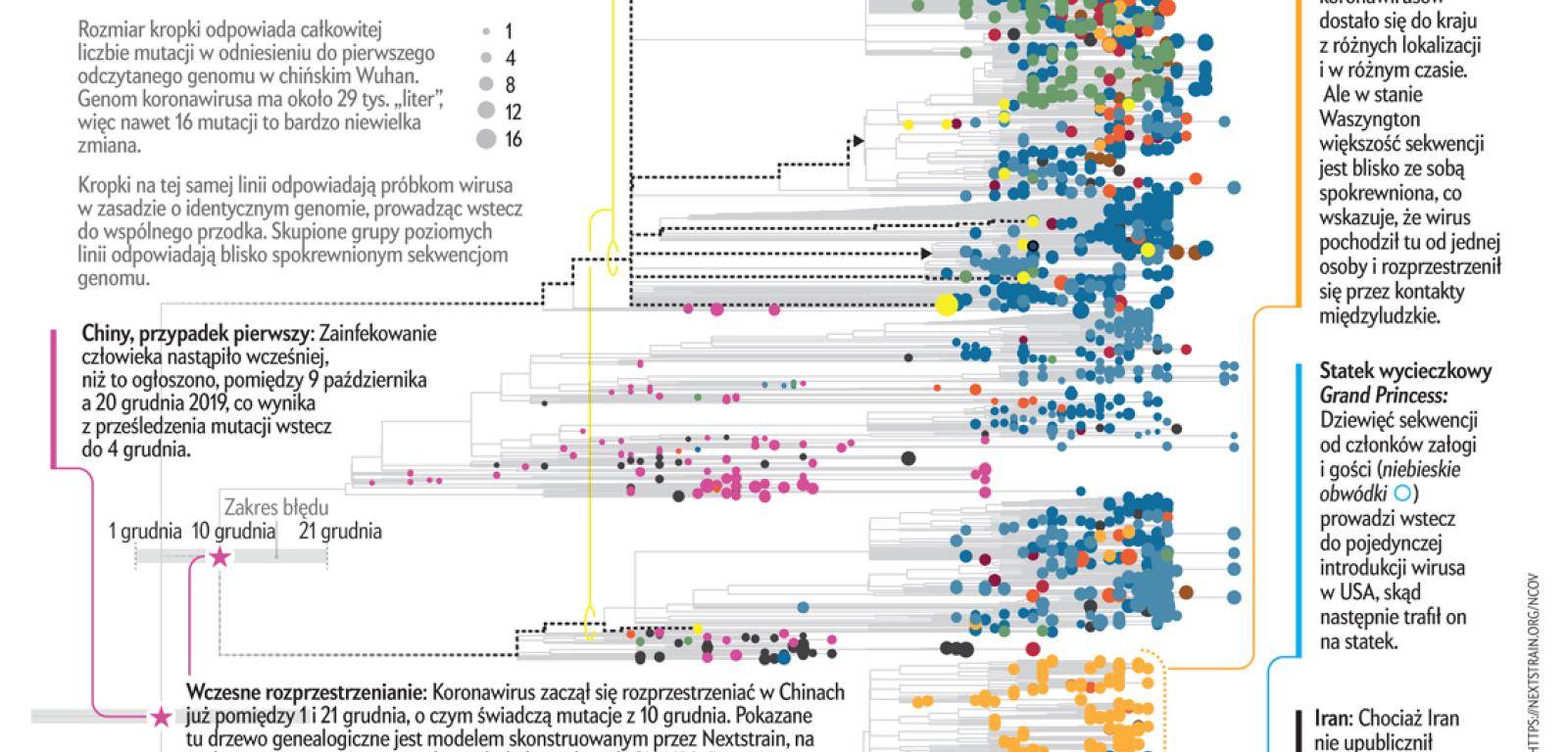 Media usiłują wytłumaczyć, jak wirus rozprzestrzeniał się podczas pierwszych czterech miesięcy pandemii, ale prawdziwą historię opowiadają sekwencje genetyczne koronawirusa udostępnione przez laboratoria – kiedy wirus dotarł do danego miejsca i skąd przybył. Sekwencje, w kolejności od lewej do prawej strony infografiki, pokazują, że wirus przeskoczył ze zwierzęcia na człowieka w Chinach, również w Chinach zainfekowany człowiek przekazał go innym ludziom, którzy następnie rozprzestrzenili zarazek po całym świecie, podróżując.