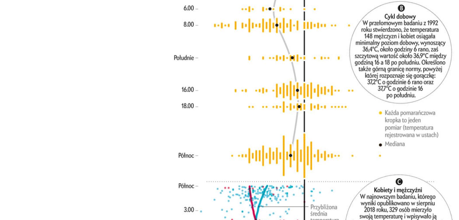 Normalna temperatura ciała to 37°C, prawda? Niezupełnie. U ludzi nie istnieje żadna wartość bazowa A, a gdyby nawet istniała, to byłaby raczej zbliżona do 36,5°C. Temperatura waha się także w ciągu dnia, osiągając najwyższe wartości późnym popołudniem, zaś najniższe wczesnym rankiem B. Ponadto jest nieco wyższa u kobiet niż u mężczyzn C. Przed dwa dziesięciolecia badania obalały próg, określony jeszcze w 1868 roku, a mimo to trzyma się on mocno. Jonathan S. Hausmann, reumatolog z Boston Children’s Hospital, który kierował ostatnim badaniem, mówi, że jednym z ważnych aspektów jest określenie na nowo definicji gorączki.