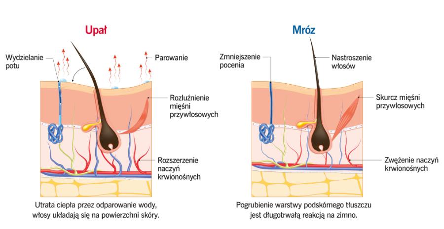 Przy zbyt niskich lub bardzo wysokich temperaturach otoczenia czujemy się gorzej. Organizm usilnie wtedy walczy o utrzymanie warunków wewnętrznych na mniej więcej wyrównanym poziomie, aby komórki i narządy mogły prawidłowo funkcjonować. Pomaga w tym pocenie. Parowanie wody z powierzchni skóry jest bowiem najefektywniejszym mechanizmem wymiany cieplnej pomiędzy wnętrzem ustroju a otoczeniem. To dlatego natura hojnie obdarzyła nas gruczołami potowymi, aby ciało się nie przegrzewało. Łącznie posiadamy ich 2–3 mln, a na 1 cm2 skóry może być w niektórych okolicach nawet 200.