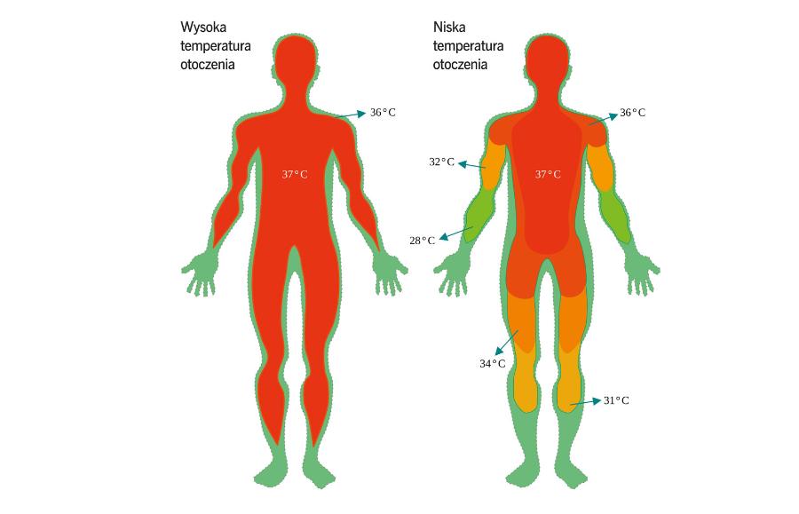 Co zabezpiecza organy wewnętrzne przed przegrzaniem, ale też przed wyziębieniem? Otóż takim termostatem i centrum dowodzenia jest wspomniane wcześniej podwzgórze, które decyduje, czy np. uruchomić drżenie mięśniowe albo obkurczyć naczynia krwionośne. Odbiera ono sygnały wysyłane przez znajdujące się w skórze termoreceptory, czyli wolne zakończenia komórek nerwowych. Dodatkową informację niesie temperatura przepływającej przez podwzgórze krwi.