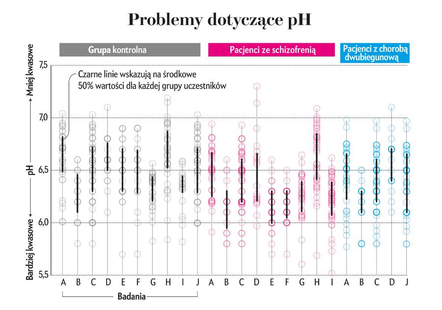 Pod wpływem takich pytań Tsuyoshi Miyakawa, neurobiolog z Fujita Health University w Japonii, przeszukał wraz ze współpracownikami 10 zestawów danych z badań post mortem mózgów ponad 400 pacjentów dotkniętych schizofrenią albo chorobą dwubiegunową. Celem było przeanalizowanie wszystkich głównych teorii dotyczących zależności pomiędzy kwasowością a chorobami.