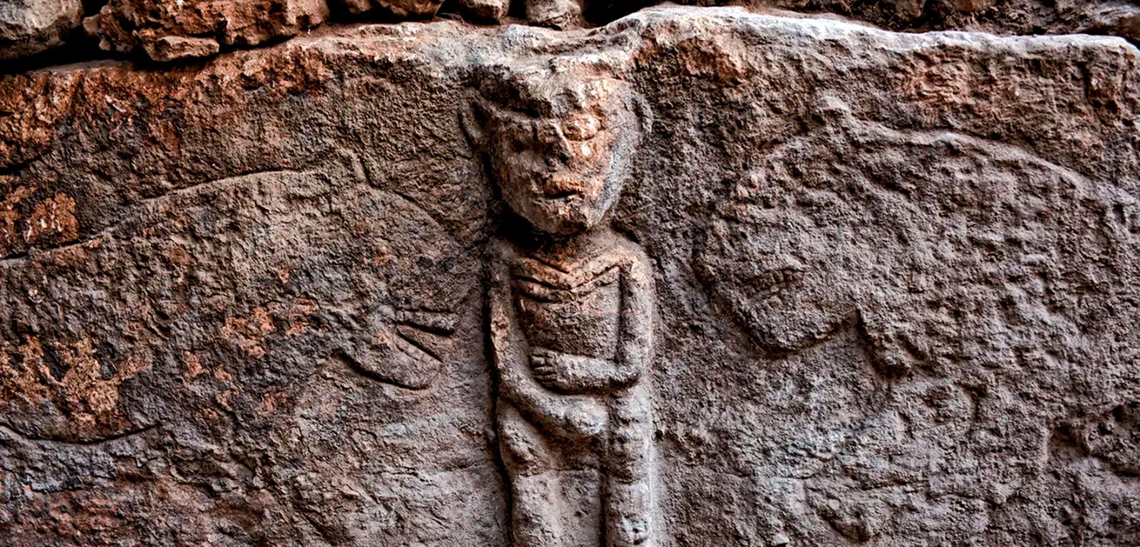 W pierwszej scenie stojący przed szarżującym bykiem mężczyzna unosi ręce, trzymając w jednej węża lub grzechotkę. W kolejnej – drugi mężczyzna atakowany jest przez dwa samce lampartów. Przedstawiony jest bardzo plastycznie, en face. Widać, że ma okrągłą twarz, duże uszy, wyłupiaste oczy, grube wargi, a na szyi trójkątny naszyjnik lub opaskę. Dłonią obejmuje swojego penisa.