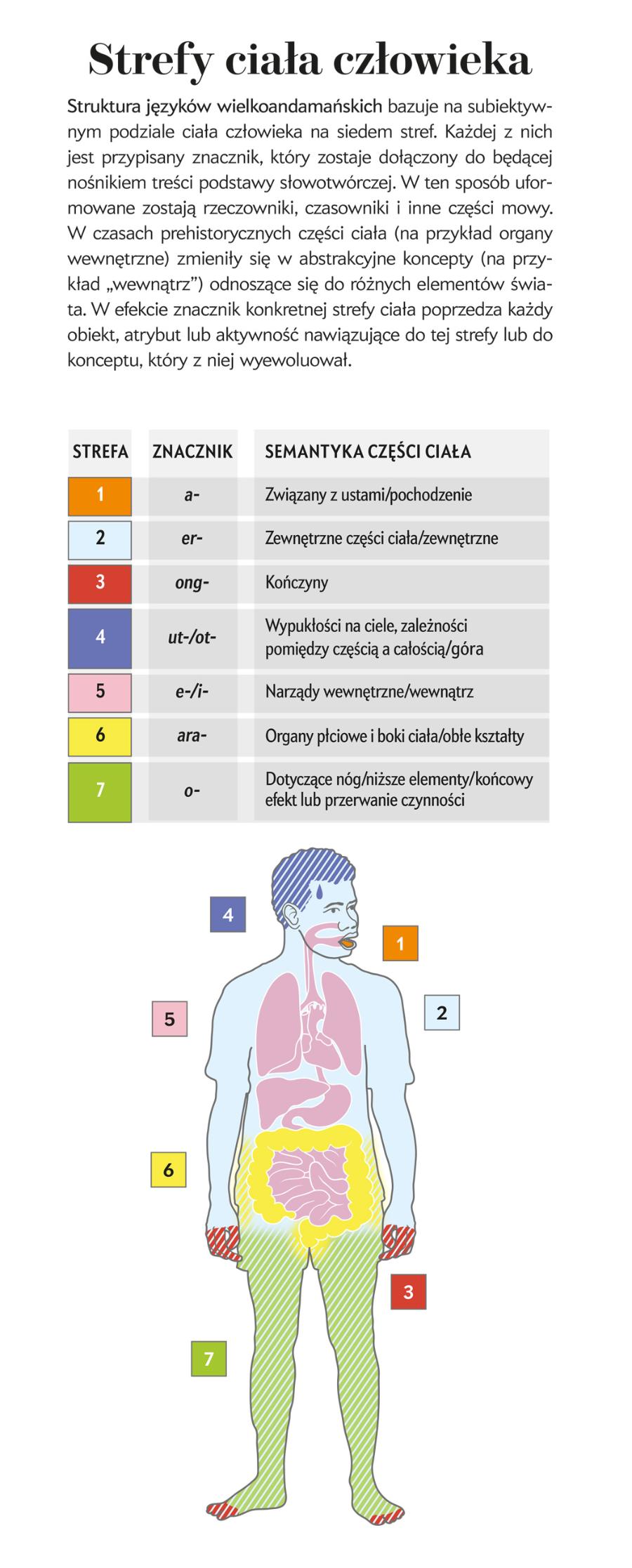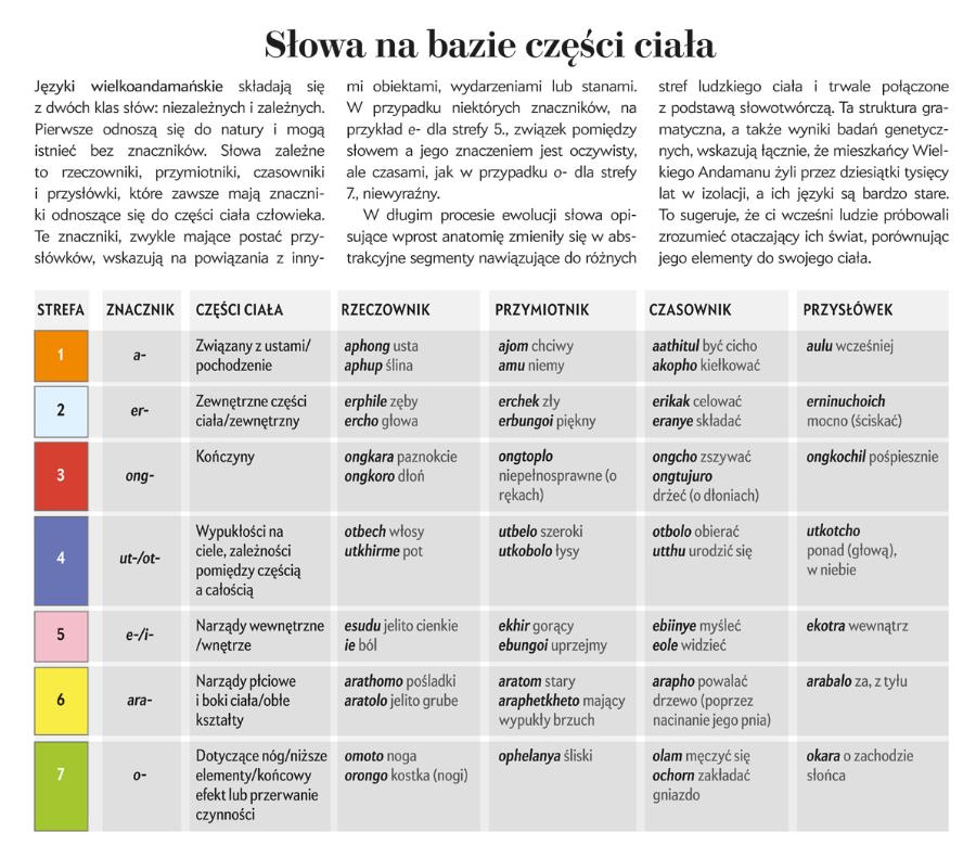 Wielkoandamańskie języki okazały się wyjątkowe wśród języków świata pod względem swojego antropocentryzmu. Sięgają po kategorie znaczeń dotyczących ludzkiego ciała, aby za ich pomocą opisać takie abstrakcyjne koncepty, jak orientacja przestrzenna czy też relacje pomiędzy obiektami. Oczywiście w angielskim też znajdziemy takie formy, na przykład „the room faces the bay”, „the chair leg broke” albo „she heads the firm”. Jednak w wielkoandamańskich językach takie kategorie przybierają ekstremalną formę zbudowaną z morfemów, czyli najmniejszych znaczeniowych jednostek mowy, w których nazwy rozmaitych części ciała są dołączane do rzeczowników, czasowników, przymiotników i przysłówków – w gruncie rzeczy do wszystkich części mowy – w celu uzyskania nowych znaczeń. Ponieważ żaden znany język nie ma gramatyki opartej na ludzkim ciele ani też w żadnym nie występują wspólne znaczeniowo albo podobnie wymawiane wyrażenia pokrewne, wielkoandamańskie mowy tworzą swoją własną rodzinę.
