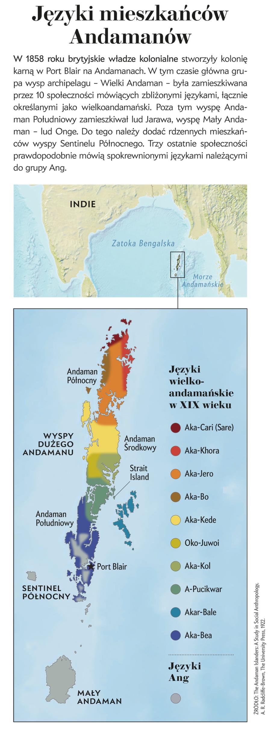 Kiedy w 1858 roku Brytyjczycy zakładali kolonię karną w Port Blair, lasy deszczowe Wielkiego Andamanu – składającego się z Andamanu Północnego, Środkowego i Południowego oraz kilku mniejszych wysp – zamieszkiwało 10 plemion łowców i zbieraczy, które kulturowo były do siebie zbliżone. Mieszkańcy Wielkiego Andamanu stawili opór najeźdźcom, ale ich łuki i strzały nie miały szans z karabinami, a w jednym przypadku – z działami okrętowymi. Jeszcze bardziej zabójcze okazały się zarazki przywleczone przez obcych, na które mieszkańcy wysp nie byli uodpornieni. Gdy w latach 60. Andamany stały się częścią Indii, żyło tam jedynie 19 przedstawicieli plemienia Wielkich Andamanów. Mieszkali w lasach Andamanu Północnego. Władze indyjskie przeniosły ich na małą wyspę Strait Island.