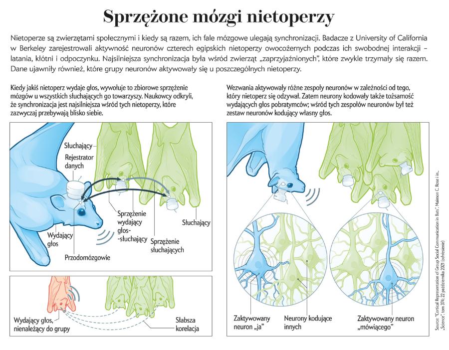 Nietrudno trafić do laboratorium Michaela Yartseva na University of California w Berkeley. Małe, czarne, plastikowe skrzydła nietoperza przypięte są do ściany obok tabliczki z jego nazwiskiem, jakby trzepotały koło drzwi. Tu zawsze jest Halloween i tu w roku 2019 Yartsev i Wujie Zhang, odbywający staż podoktorski, pierwsi wykazali, że aktywności mózgów nietoperzy synchronizują się tak samo, jak ludzkich. Chociaż naukowcy od dawna badali zbiorowe zachowania zwierząt, od owadów po ssaki, nigdy nie sięgali w tym celu do poziomu mózgu.