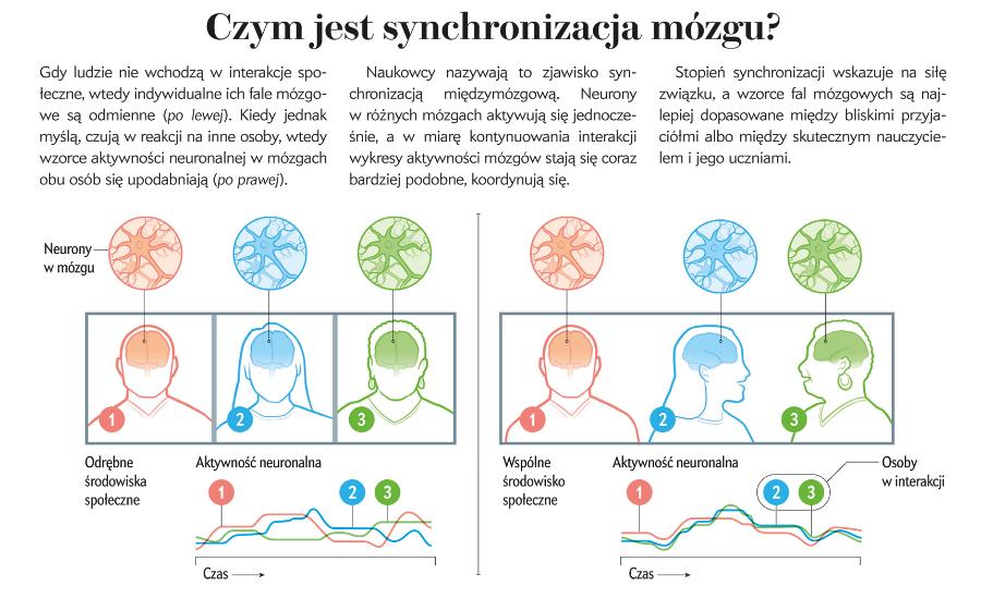 Naukowcy wykrywają synchronizację u ludzi i zwierząt oraz mapują jej przebieg – rytm, zgranie i nasilenie – aby lepiej zrozumieć, jakie korzyści mogą z niej wynikać. Znajdują dowody na to, że synchronizacja mózgów stanowi przygotowanie do interakcji i zaczynają uznawać ją za wyznacznik relacji. Biorąc pod uwagę, że zsynchronizowane doświadczenia są często przyjemne, badacze podejrzewają, że jest to zjawisko korzystne: pomaga wchodzić w interakcje i być może ułatwia ewolucję społeczności. Ten nowy rodzaj badań mózgu może również wyjaśnić, dlaczego nie zawsze możemy się z kimś zgrać lub dlaczego izolacja społeczna jest szkodliwa zarówno dla zdrowia fizycznego, jak i psychicznego.