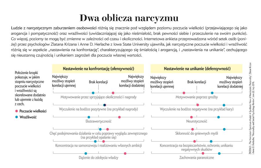 Na początku XXI wieku Aaron Pincus, psycholog kliniczny z Pennsylvania State University, stwierdził, że to skupienie się na poczuciu wielkości nie odzwierciedla dokładnie tego, co obserwuje u narcystycznych pacjentów. „Całkowicie pomija się to, co zwykle skłania pacjentów do przyjścia na terapię, czyli wrażliwość i niepokój – mówi Pincus. – To sprawiło, że podjąłem misję wypracowania precyzyjniejszego podejścia naukowego”. W pracy przeglądowej z 2008 roku Pincus i jego współpracownicy ukazali ogromną zmienność w sposobie, w jaki specjaliści w zakresie zdrowia psychicznego konceptualizowali NPD, z dziesiątkami określeń na charakterystyczne przejawy narcyzmu. Niemniej był tu również element wspólny – podział na wspaniałościowe i wrażliwościowe sposoby, jakimi to zaburzenie się wyraża.