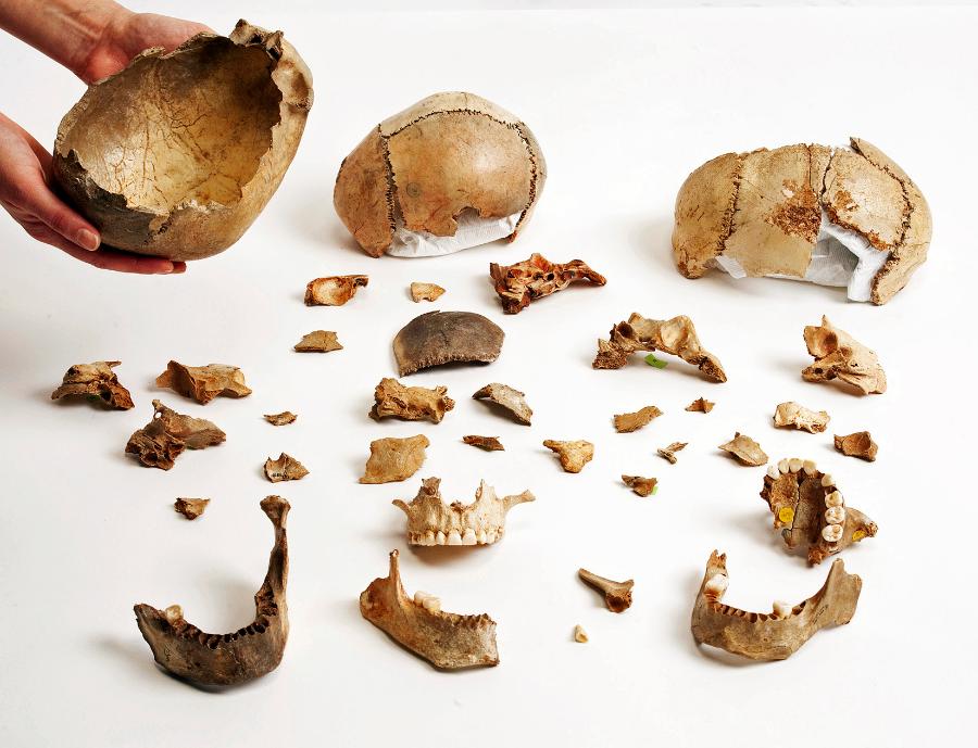 Wśród ludzkich kości wykorzystanych pośmiertnie była czaszka mężczyzny w średnim wieku, którą zeskrobano kamiennymi narzędziami i uformowano z niej czarę czy piszczel nastolatka, która została złamana, wypolerowana i zaokrąglona w coś w rodzaju skrobacza do oczyszczania skór zabitych zwierząt. Wiele wskazuje na to, że złamano też kilka kości długich i wydrapano z nich szpik zapewne w celu spożycia, niewykluczone, że w ramach jakiejś kulturowej praktyki „oczyszczania szczątków”. A ponieważ na kościach nie ma śladów przedśmiertnej przemocy, można wykluczyć, że chodziło tu o walkę o władzę między różnymi populacjami.