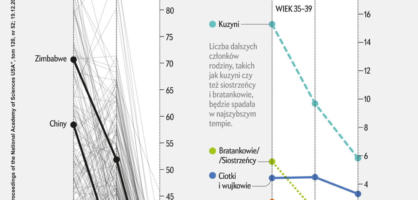 Na świecie zachodzą szybkie zmiany w strukturze rodzin. To konsekwencja globalnej tendencji demograficznej – malejącej liczby urodzeń i zgonów. W opublikowanej ostatnio pracy naukowcy oszacowali, że w 2095 roku kobieta w wieku 65 lat będzie miała przeciętnie 25 krewnych. Dla porównania, w 1950 roku takich krewnych było średnio 41. Ta niemal dwukrotna, w skali globu, redukcja będzie miała jeszcze większą skalę w krajach, w których nie ma silnego instytucjonalnego wsparcia dla rodzin, na przykład w Zimbabwe, gdzie wielkość rodziny zmniejszy się o 75%.