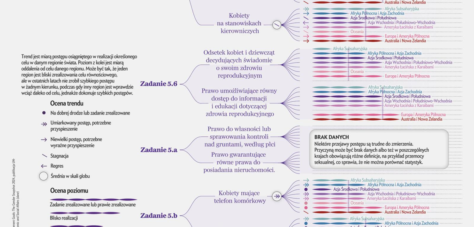 Na całym świecie kobiety i dziewczęta wciąż borykają się z dyskryminacją, ubóstwem i przemocą, a także z brakiem dostępu do edukacji i opieki zdrowotnej oraz z ograniczaniem prawa własności, by wymienić tylko niektóre z barier. Każdego roku dwie agendy ONZ – Biuro ds. Kobiet oraz Departament Spraw Gospodarczych i Społecznych – przedstawiają raport na temat postępów we wprowadzaniu równości płci na świecie. To jeden z 17 Celów Zrównoważonego Rozwoju, które kraje członkowskie ONZ zgodziły się osiągnąć do 2030 roku. Raport przygotowano na podstawie danych dostarczonych przez rządy państw w specjalnych kwestionariuszach, danych pozyskanych podczas badań gospodarstw domowych oraz zebranych przez inne międzynarodowe organizacje, takie jak Światowa Organizacja Zdrowia, Bank Światowy i Fundusz Narodów Zjednoczonych na rzecz Dzieci (UNICEF).