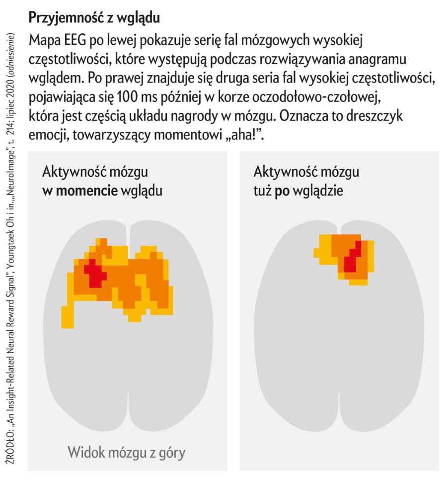 Lata 90. przyniosły szybki rozwój neuroobrazowania. Na początku XXI wieku doszliśmy z Markiem Beemanem, neurokognitywistą z University of Pennsylvania, do wniosku, że technika neuroobrazowania jest wystarczająco zaawansowana, by spróbować za jej pomocą ustalić, co dzieje się w mózgu podczas wglądu. Użyliśmy dwóch komplementarnych metod: elektroencefalografii (EEG) i obrazowania metodą czynnościowego jądrowego rezonansu magnetycznego (fMRI). EEG mierzy aktywność elektryczną mózgu za pomocą elektrod umieszczonych na skórze głowy. Dostarcza bardzo precyzyjnych informacji, gdy coś się dzieje w mózgu. Natomiast fMRI rejestruje wolne zmiany przepływu krwi (intensywnie pracujący obszar mózgu pobiera więcej krwi) i dostarcza szczegółowych map aktywnych obszarów. Wykorzystując EEG i fMRI w równoległych eksperymentach z różnymi osobami rozwiązującymi te same łamigłówki, potrafiliśmy wyodrębnić momenty „aha!” mózgu w przestrzeni i w czasie.