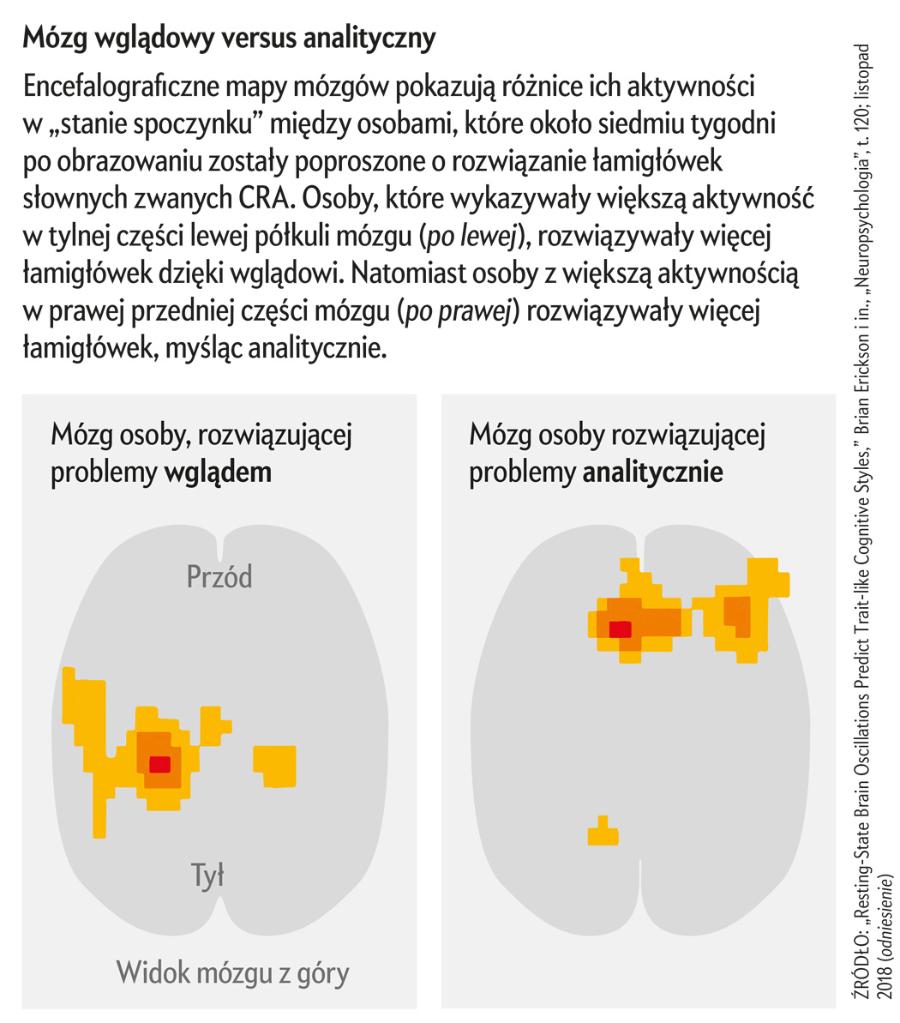 Przed kilkunastu laty Brian Erickson, doktorant w laboratorium Drexel University, wykazał, że różnica między tym, czy mamy skłonność do wglądu, czy do myślenia analitycznego, widoczna jest wyraźnie podczas aktywności mózgu w „stanie spoczynku” – podczas relaksu, bezczynności, braku oczekiwań. Erickson rejestrował EEG w stanie spoczynku grupy osób, a kilka tygodni później zlecił tym samym osobom rozwiązanie serii anagramów. Zaskakujący wynik: w kilka minut EEG przewidywał, czy dana osoba rozwiąże łamigłówki głównie przez wgląd, czy analitycznie. Stąd wniosek, że nasz dominujący styl myślenia jest stabilny w czasie.