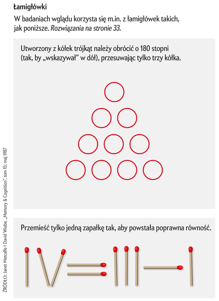 Nie mogliśmy bazować na trudnych łamigłówkach, bowiem aby wyniki były statystycznie istotne, każda osoba powinna rozwiązać wiele problemów. Wykorzystaliśmy więc zadania słowne – złożone odległe skojarzenia (compound remote associate, CRA), które można rozwiązywać wglądem lub analitycznie. Każde zadanie składało się z trzech słów, na przykład „pine”, „crab” i „sauce” (sosna, krab, sos). Rozwiązanie polegało na znalezieniu czwartego słowa, które z każdym z podanych może tworzyć nazwę złożoną lub zrost. Natychmiast po rozwiązaniu łamigłówki badany informował, czy rozwiązanie pojawiło się nagle, czy w wyniku świadomych rozważań. Dzięki temu mogliśmy wyodrębnić efekty „aha!” i porównać towarzyszącą im aktywność mózgu z aktywnością przy rozwiązaniach analitycznych. Rozwiązanie powyższej łamigłówki to „apple”, bo istnieją: „pineapple”, „crab apple” i „sauce apple” (ananas, rajskie jabłuszko, mus jabłkowy).