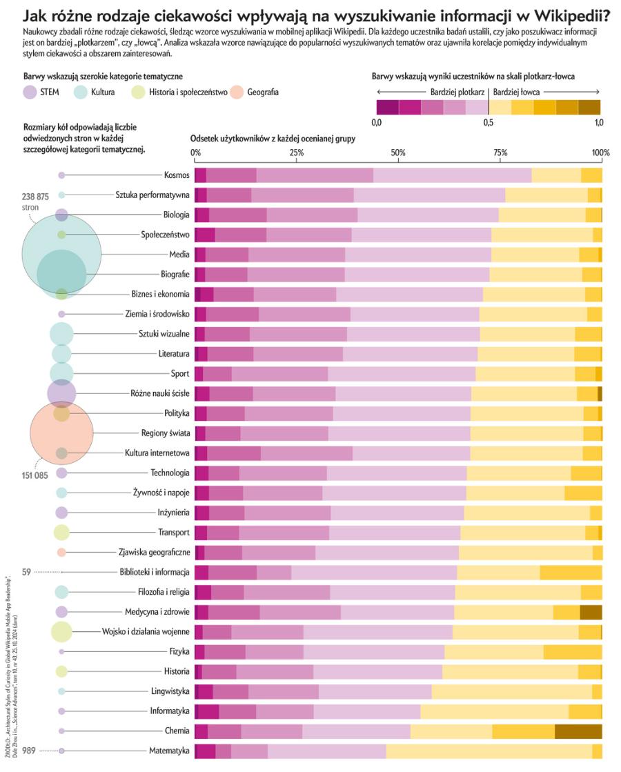 W krajach o wyższym poziomie wykształcenia obywateli oraz większej równości płci użytkownicy Wikipedii byli częściej plotkarzami. W krajach z niższymi wskaźnikami obu tych zmiennych ludzie przeglądali strony jak łowcy. Bassett przypuszcza, że „w krajach z silnymi strukturami opresyjnymi lub patriarchalnymi produkcja wiedzy może być ograniczona, co popycha ludzi w stronę takiego hiperskupienia”. Naukowcy przeanalizowali również tematy zainteresowań, od fizyki po sztuki wizualne, porównując plotkarzy z łowcami (patrz infografika). Wzorce typowe dla tancerzy nie zostały uwzględnione, ponieważ opisano je dopiero niedawno.