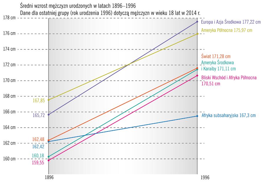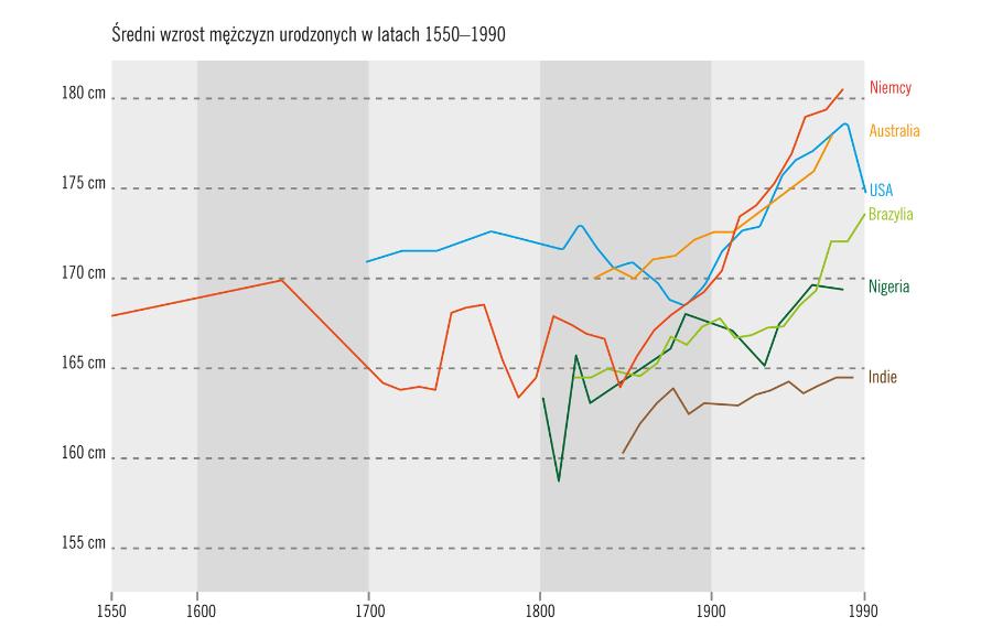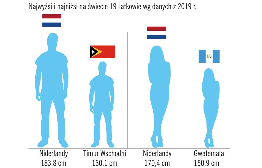 W skali globalnej średni przyrost wysokości ciała dorosłych urodzonych między 1896 a 1996 r. oszacowano na 8,3 cm dla kobiet i 8,8 cm dla mężczyzn. Palmę pierwszeństwa w tej kategorii od lat dzierżą Niderlandczycy. To najwyższy naród na świecie: średnio mężczyźni mają 184 cm, a kobiety – 171 cm. Nie zawsze jednak tak było: w połowie XIX w. Niderlandczycy byli stosunkowo niscy w porównaniu z europejskimi rówieśnikami. W 1840 r. przeciętny mężczyzna miał 164,5 cm, czyli tylko o 0,2 cm więcej od przeciętnego Francuza, o 2,1 cm mniej od typowego Niemca i o 7,7 cm mniej niż statystyczny Amerykanin. Na przełomie XIX i XX w. mieszkańcy Niderlandów zaczęli bardzo szybko rosnąć. W 1930 r. ze średnim wzrostem wynoszącym wówczas 174,1 cm byli już nieznacznie wyżsi od innych nacji, ale rosnąć nie przestawali, więc różnica między nimi a mieszkańcami pozostałych krajów stale się zwiększała. Prawdopodobnie w dużej mierze to zjawisko wyjaśnia poprawa warunków środowiskowych we wczesnym okresie życia. W kolejnych pokoleniach synowie zazwyczaj przerastali ojców, ale mimo intensywnych badań nadal nie jest jasne, co właściwie dało Niderlandczykom tak dużą przewagę nad innymi narodami. W końcu w tym samym czasie we Francji, Niemczech czy Stanach Zjednoczonych podobnie zwiększał się szeroko rozumiany dobrobyt. Zdrowiej się odżywiano, medycyna radziła sobie coraz lepiej z chorobami, weszły masowe szczepienia, poprawiła się higiena.