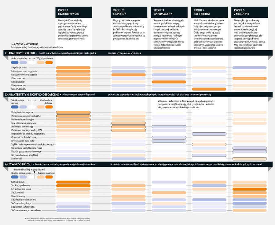 W niedawnym badaniu naukowcy przeanalizowali skany mózgu oraz dane dotyczące wpływu snu na wiele różnych aspektów zdrowia. Zbiór opierał się na relacjach 770 zdrowych młodych dorosłych. Zastosowana analiza statystyczna wykazała, że złożoną zależność między snem a zdrowiem da się opisać za pomocą pięciu odrębnych profili, które pokazują, jak określone wzorce snu wiążą się ze zmianami w różnych wymiarach naszego życia biologicznego, fizycznego i społecznego. „Nie jest tak, że czyjś sen odpowiada wyłącznie jednemu profilowi – mówi współautorka badania Valeria Kebets z Concordia University w Montrealu. – Może odpowiadać po części różnym profilom i zmienia się to zależnie od etapu naszego życia.”