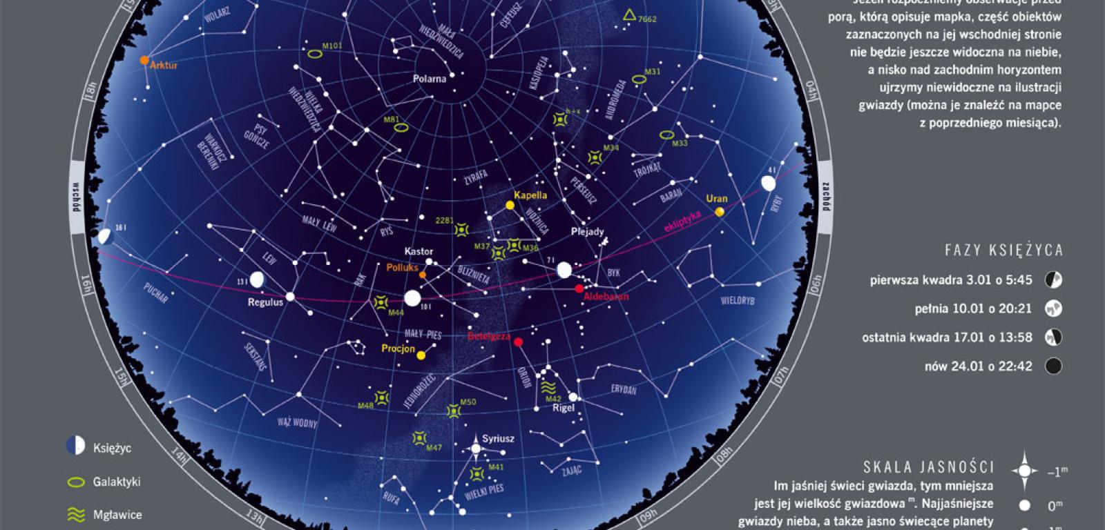 5 stycznia o 8:47 Ziemia znajdzie się najbliżej Słońca. Oba ciała będzie wówczas dzieliło zaledwie 147,1 mln km, czyli o jakieś 5 mln km mniej niż w lipcu. Jak widać, pory roku w niewielkim stopniu zależą od tych symbolicznych zmian odległości: liczą się raczej długość dnia i wysokość, na jaką Słońce wznosi się nad horyzontem. Na początku miesiąca wschodzi ono o 7:46, by zajść o 15:34. Pod koniec stycznia obie te pory przesuwają się na 7:19 i 16:20. Maksymalna wysokość Słońca nad horyzontem rośnie wraz z wydłużającym się dniem z 14,7° do 20,3°. Długie noce i fantastyczne zimowe gwiazdozbiory skłaniają nas do obserwacji nieba. Miłośnicy meteorów mogą zapolować na Kwadrantydy. Nazwa roju upamiętnia nieistniejący już gwiazdozbiór Kwadrantu. Dziś jego radiant, czyli miejsce, w którym przecinają się tory spadających gwiazd, odnajdziemy na pograniczu Wolarza, Herkulesa i Smoka. Maksimum Kwadrantydów przewidywane jest na 3 stycznia. 10 stycznia wieczorem możemy oglądać półcieniowe zaćmienie Księżyca, w trakcie którego Srebrny Glob nieco się przyciemni – zjawisko potrwa od godziny 18:08 do 22:12.
